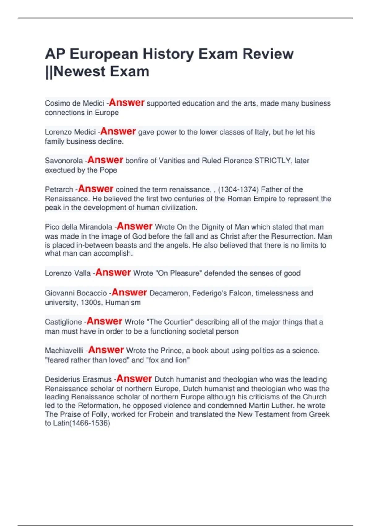Castiglione -Answer Wrote "The Courtier" describing all of the major things that a