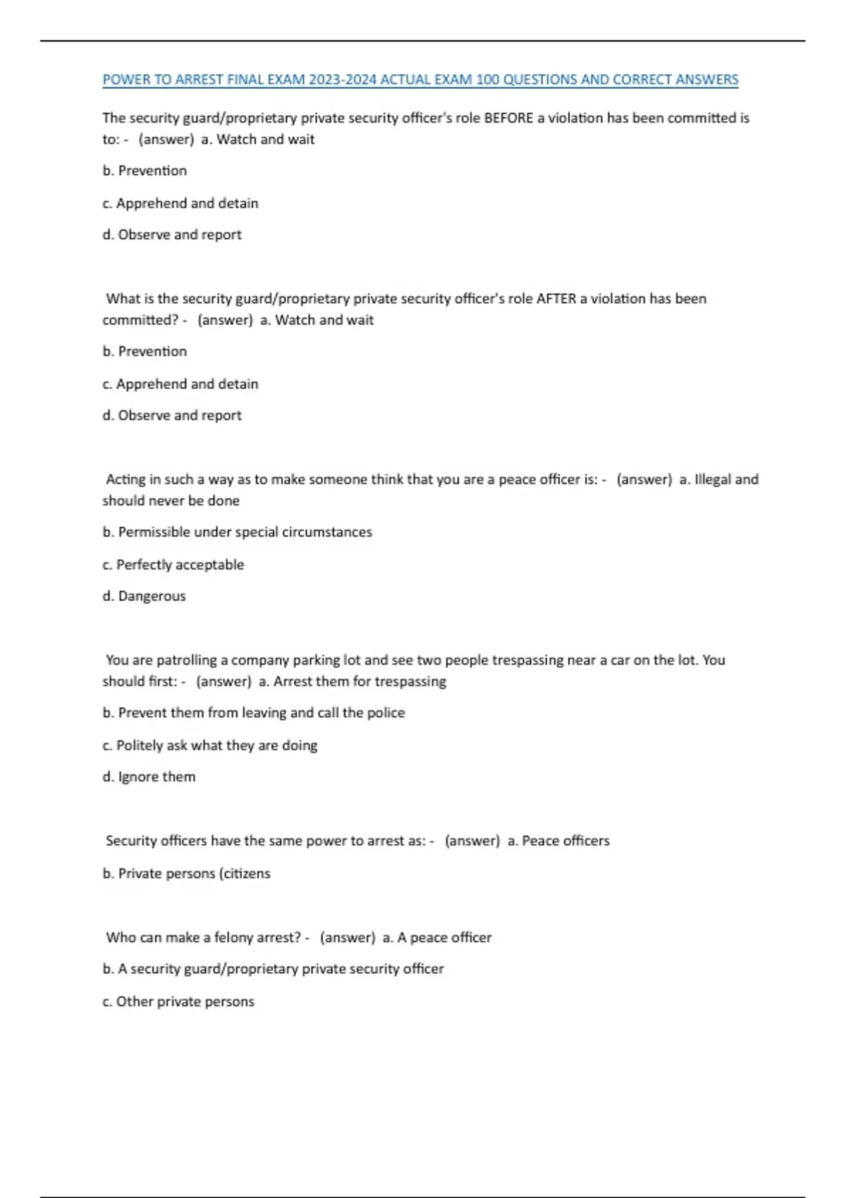 , POWER TO ARREST FINAL EXAM 2023-2024 ACTUAL EXAM 100 QUESTIONS AND CORRECT ANSWERS