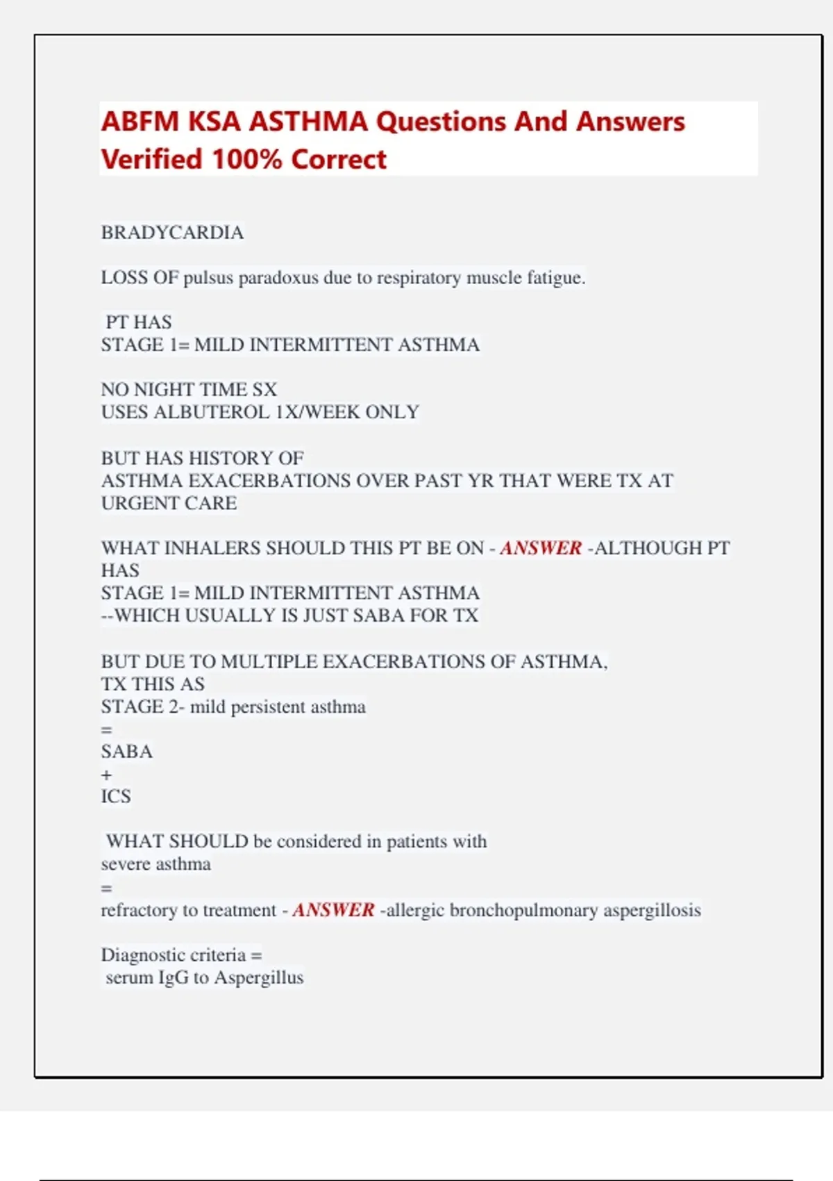 ABFM KSA ASTHMA Questions And Answers Verified 100% Correct BRADYCARDIA LOSS OF pulsus paradoxus due to respiratory muscle fatigue. PT HAS STAGE 1= MILD INTERMITTENT ASTHMA NO NIGHT TIME SX USES ALBUTEROL 1X/WEEK ONLY BUT HAS HISTORY OF ASTHMA EXACERBATIONS OVER PAST YR THAT WERE TX AT URGENT CARE WHAT INHALERS SHOULD THIS PT BE ON - ANSWER -ALTHOUGH PT HAS STAGE 1= MILD INTERMITTENT ASTHMA --WHICH USUALLY IS JUST SABA FOR TX BUT DUE TO MULTIPLE EXACERBATIONS OF ASTHMA, TX THIS AS STAGE 2- mild persistent asthma = SABA + ICS WHAT SHOULD be considered in patients with severe asthma = refractory to treatment - ANSWER -allergic bronchopulmonary aspergillosis Diagnostic criteria = serum IgG to Aspergillus associated with central bronchiectasis on high-resolution chest CT Omalizumab=antibody directed against circulating IgE. IS USED TO TX WHAT - ANSWER -IgE-mediated allergy = TRIGGER FOR ASTHMA PT WITH COPD OR ASTHMA WHICH CARDIAC STRESS TEST SHOULD BE AVOIDED IN THESE PTS - ANSWER -Adenosine OR Dipyridamole=can cause severe bronchospasm STRESS TEST WRONG ANS = DOBUTAMINE ECHO, EXERCISE STRESS TEST most common side effect of β2 -agonists IHALERS - ANSWER -TREMORS OTHER S.E. : TACHYCARDIA WHICH ELECTROLYTE ABNORMALITY CAN BE CAUSE BY B2 AGONIST INHALERS - ANSWER -HYPO-K-ALEMIA- pushes K into cells how do B2 AGONIST INHALERS AFTER BLOOD SUGAR LEVELS - ANSWER -CAN CAUSE HYPER-GLYCEMIA PT WITH H/O ocular herpes simplex WHICH ASTHMA MED SHOULD BE AVOIDED IN THIS PT WHICH ASTHMA MED SHOULD BE GIVE - ANSWER -AVOID= ICS= IF HISTORY OF ocular herpes simplex INSTEAD OF GIVING ICS = GIVE LK RECEPTOR ANTAGONIST PT WITH ALLERGIC RHINITIS HAS MODERATE PERSISTENT ASTHMA NOT CONTROLLED WITH SABA+ICS+LABA WHAT MED CAN DOC ADD TO CONTROL ASTHMA - ANSWER -LK RECEPTOR ANTAGONIST ADD THIS TO CURRENT REGIMEN OF ICS+SABA+LABA TO PT WITH ALLERGIC -- ASTHMA Airflow obstruction is defined as an FEV 1 /FVC ratio 70%. Airway reversibility is defined as an increase in FEV 1 or FVC b - ANSWER - CLASSIFY STAGE OF ASTHMA wheezing episodes 3-5 days per week and nighttime awakenings no morethan 3 times a month. - ANSWER -STAGE 2- mild persistent asthma most common ALLERGEN THAT INDUCES ASTHMA SX IN SPRING TIME - ANSWER -TREE POLLEN WRONG ANS= GRASS