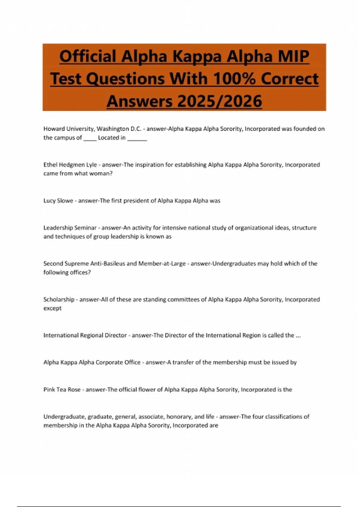 Official Alpha Kappa Alpha MIP Test Questions With 100% Correct Answers 2025/2026 Howard University, Washington D.C. - answer-Alpha Kappa Alpha Sorority, Incorporated was founded on the campus of ____ Located in ______ Ethel Hedgmen Lyle - answer-The inspiration for establishing Alpha Kappa Alpha Sorority, Incorporated came from what woman? Lucy Slowe - answer-The first president of Alpha Kappa Alpha was Leadership Seminar - answer-An activity for intensive national study of organizational ideas, structure and techniques of group leadership is known as Second Supreme Anti-Basileus and Member-at-Large - answer-Undergraduates may hold which of the following offices? Scholarship - answer-All of these are standing committees of Alpha Kappa Alpha Sorority, Incorporated except International Regional Director - answer-The Director of the International Region is called the ... Alpha Kappa Alpha Corporate Office - answer-A transfer of the membership must be issued by Pink Tea Rose - answer-The official flower of Alpha Kappa Alpha Sorority, Incorporated is the Undergraduate, graduate, general, associate, honorary, and life - answer-The four classifications of membership in the Alpha Kappa Alpha Sorority, Incorporated areBiennially - every two years - answer-How often does the Boule meet? To promote unique services - answer-Which item is NOT one of the purposes of Alpha Kappa Alpha Sorority, Incorporated? January 15, 1908 - answer-When was Alpha Kappa Alpha founded? A one-week tour of cities which are significant to Black history - answer-The Domestic Travel Tour was The Alpha Kappa Alpha Corporate Office - answer-The administrative division of the Boule is True - answer-Alpha Kappa Alpha is composed of chapters of equal rank known as the graduate and undergraduate. True - answer-The sorority was incorporated on January 29, 1913.