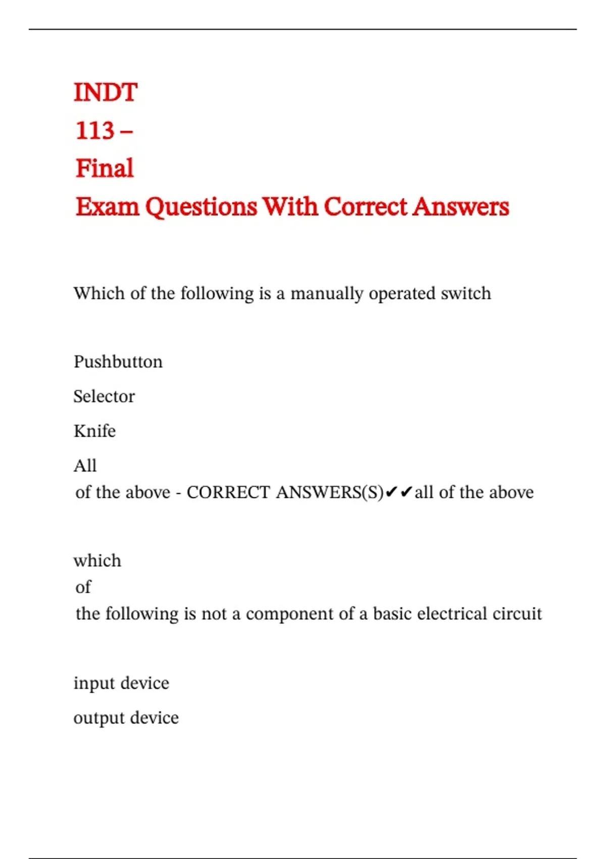 INDT 113 – Final Exam Questions With Correct Answers ,