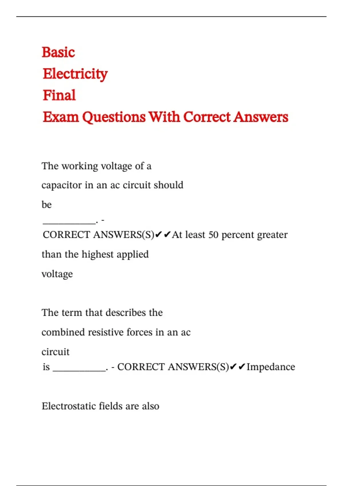 Basic Electricity Final Exam Questions With Correct Answers