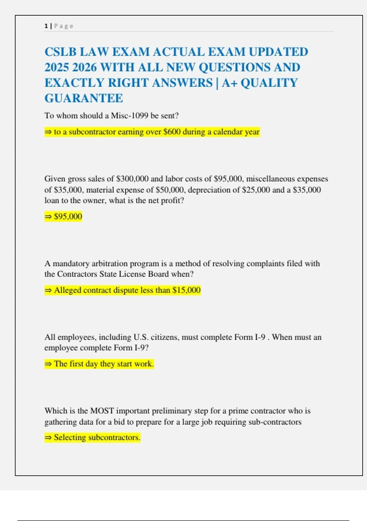 CSLB LAW EXAM ACTUAL EXAM UPDATED WITH ALL NEW QUESTIONS AND EXACTLY RIGHT ANSWERS | A+ QUALITY GUARANTEE