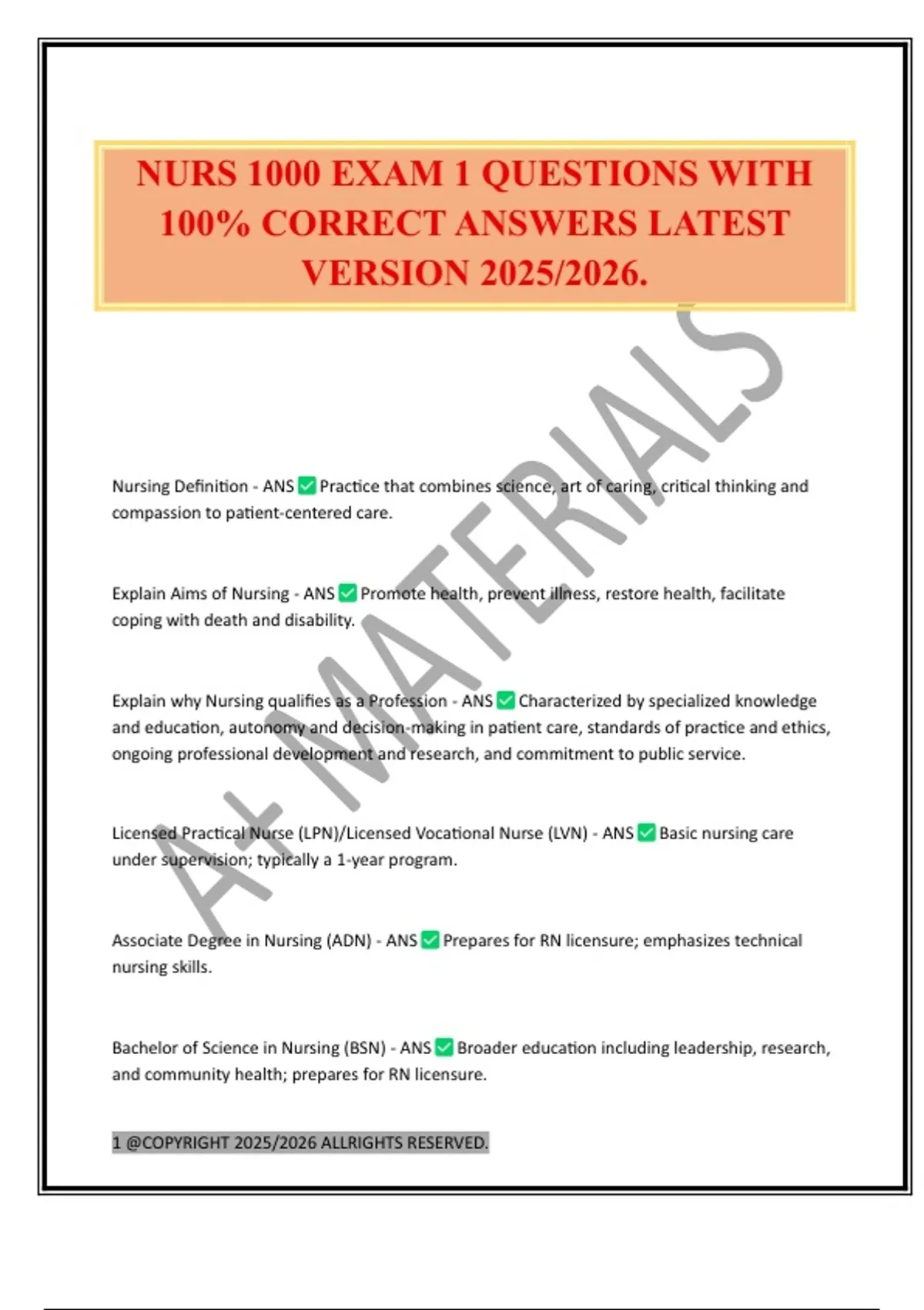 NURS 1000 EXAM 1 QUESTIONS WITH