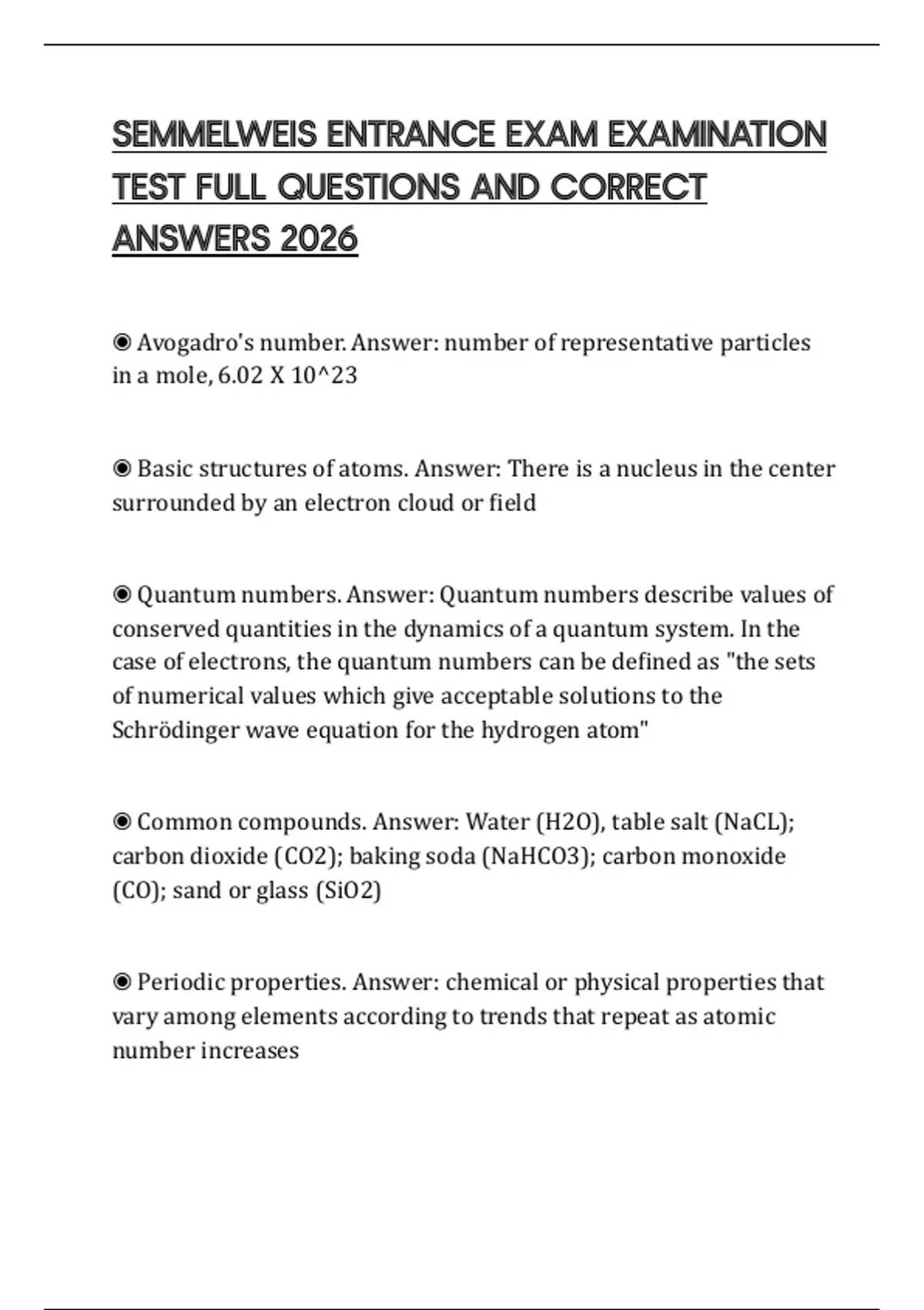 SEMMELWEIS ENTRANCE EXAM EXAMINATION TEST FULL QUESTIONS AND CORRECT ANSWERS 2026