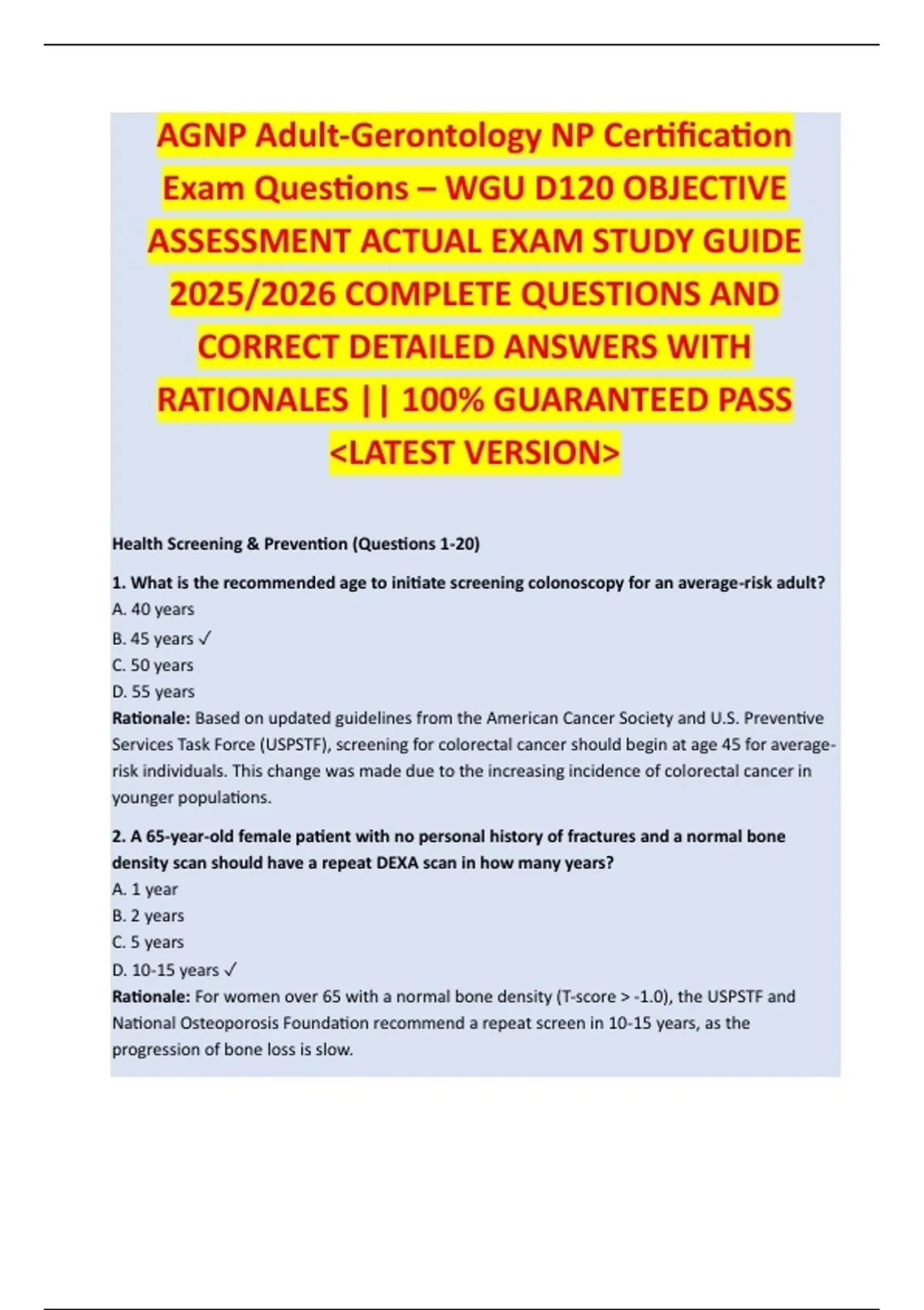 AGNP Adult-Gerontology NP Certification Exam Questions – WGU D120 OBJECTIVE ASSESSMENT ACTUAL EXAM STUDY GUIDE 2025/2026 COMPLETE QUESTIONS AND CORRECT DETAILED ANSWERS WITH RATIONALES || 100% GUARANTEED PASS LATEST VERSION