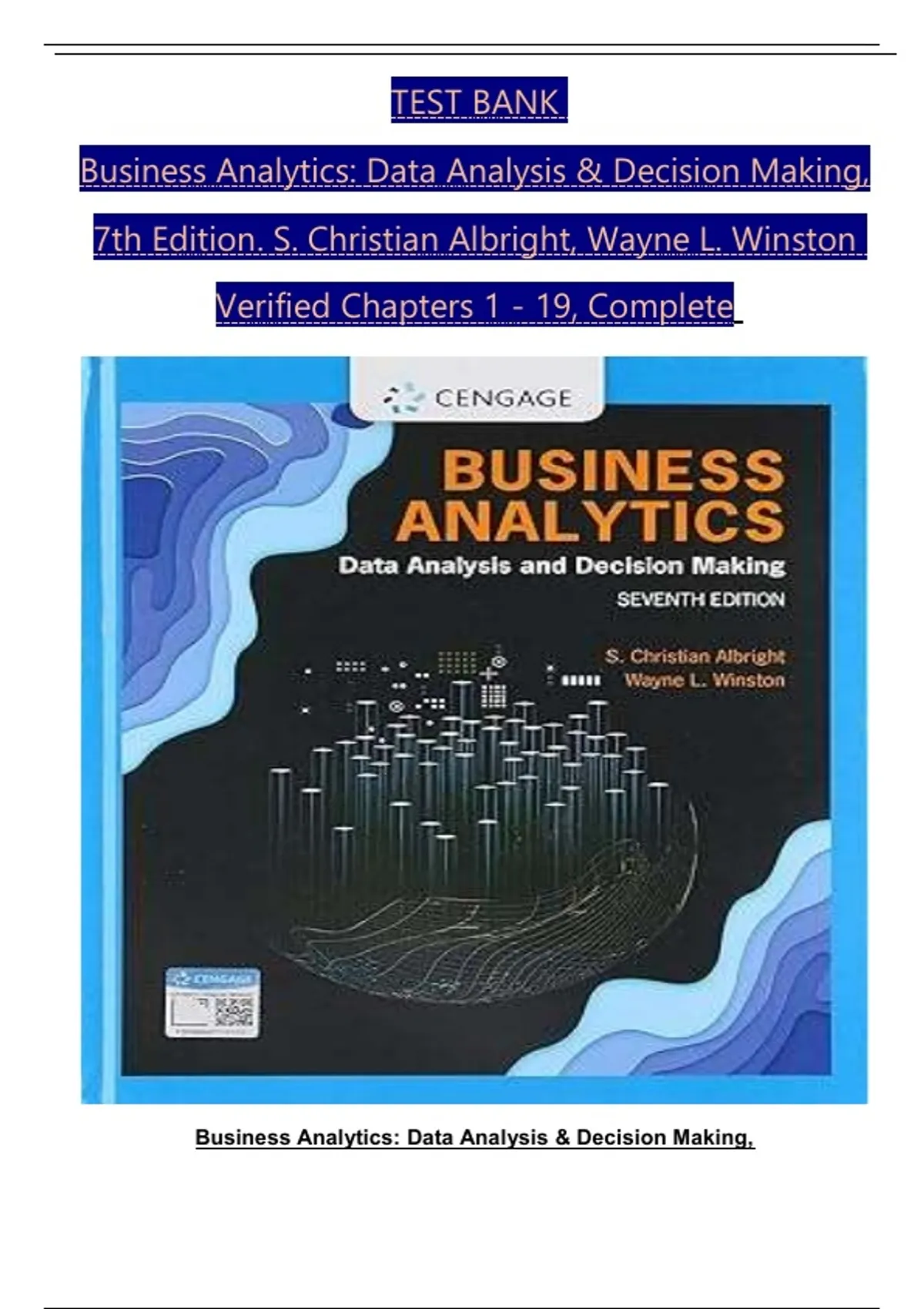 TEST BANK For Business Analytics: Data Analysis & Decision Making, 7th Edition by S. Christian Albright, Wayne L. Winston, Verified Chapters 1 - 19, Complete Newest Version