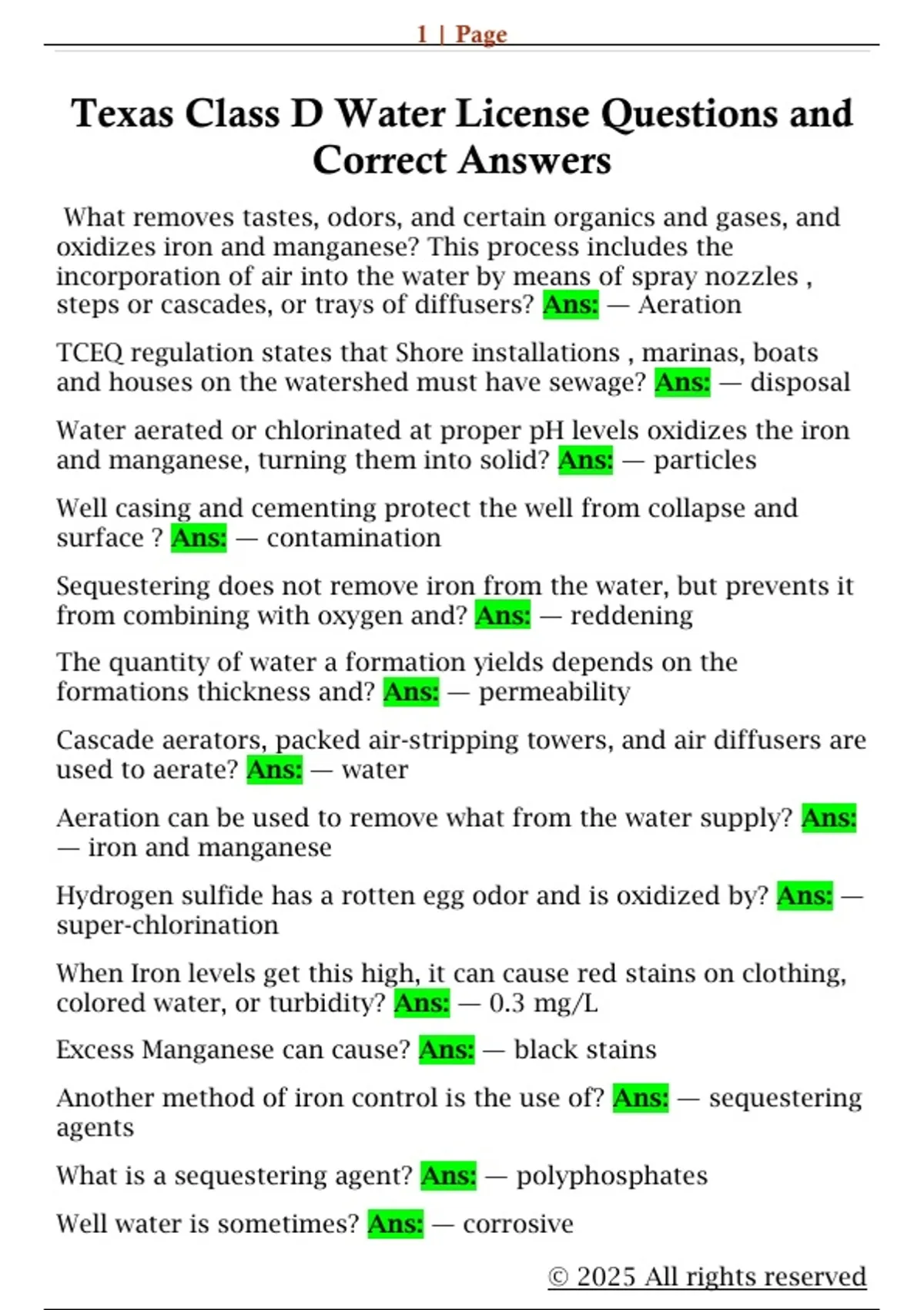 Texas Class D Water License Questions and Correct AnswersTexas Class D Water License Questions and Correct AnswersTexas Class D Water License Questions and Correct AnswersTexas Class D Water License Questions and Correct AnswersTexas Class D Water License Questions and Correct AnswersTexas Class D Water License Questions and Correct AnswersTexas Class D Water License Questions and Correct Answers