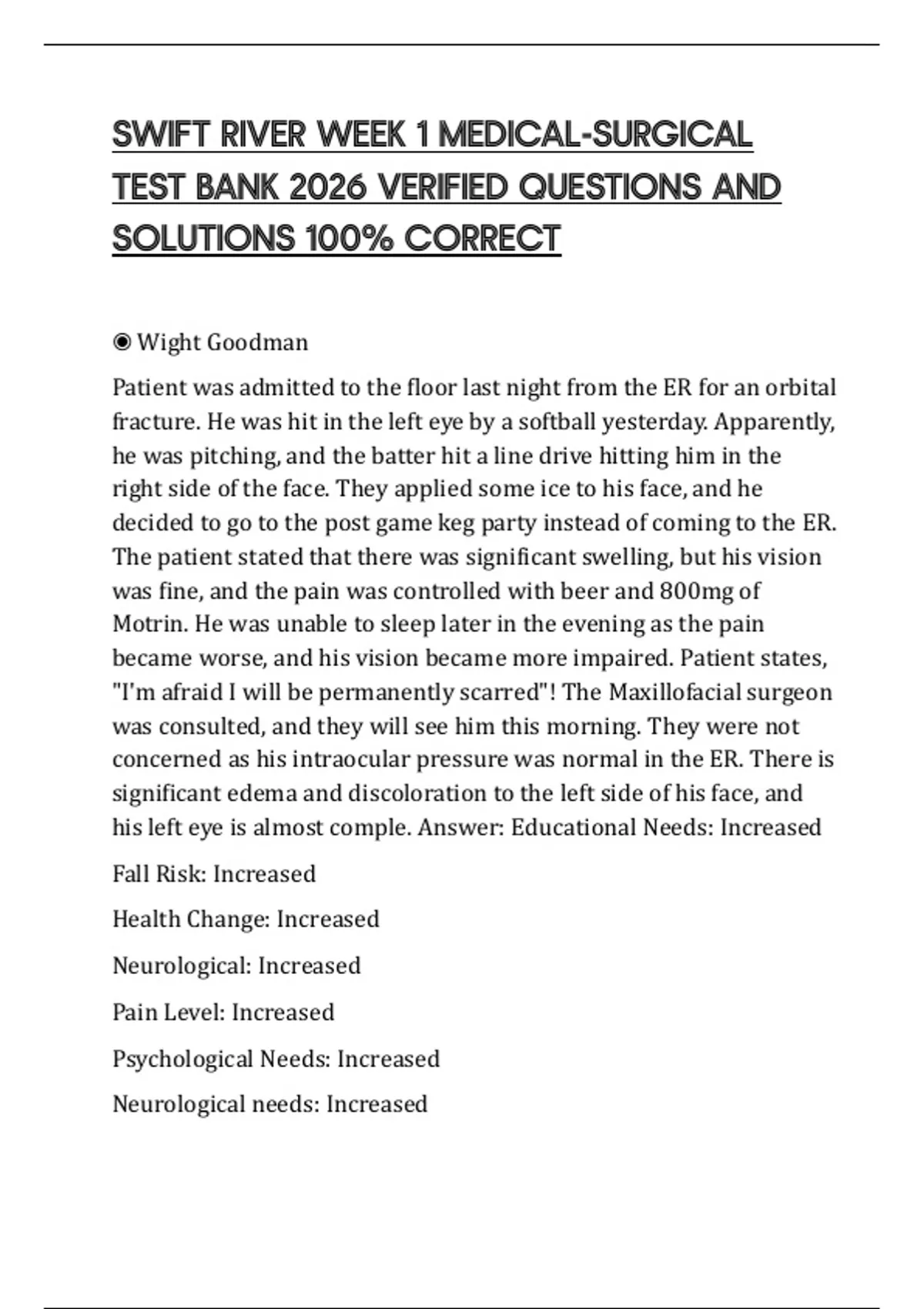 SWIFT RIVER WEEK 1 MEDICAL-SURGICAL TEST BANK 2026 VERIFIED QUESTIONS AND SOLUTIONS 100% CORRECT