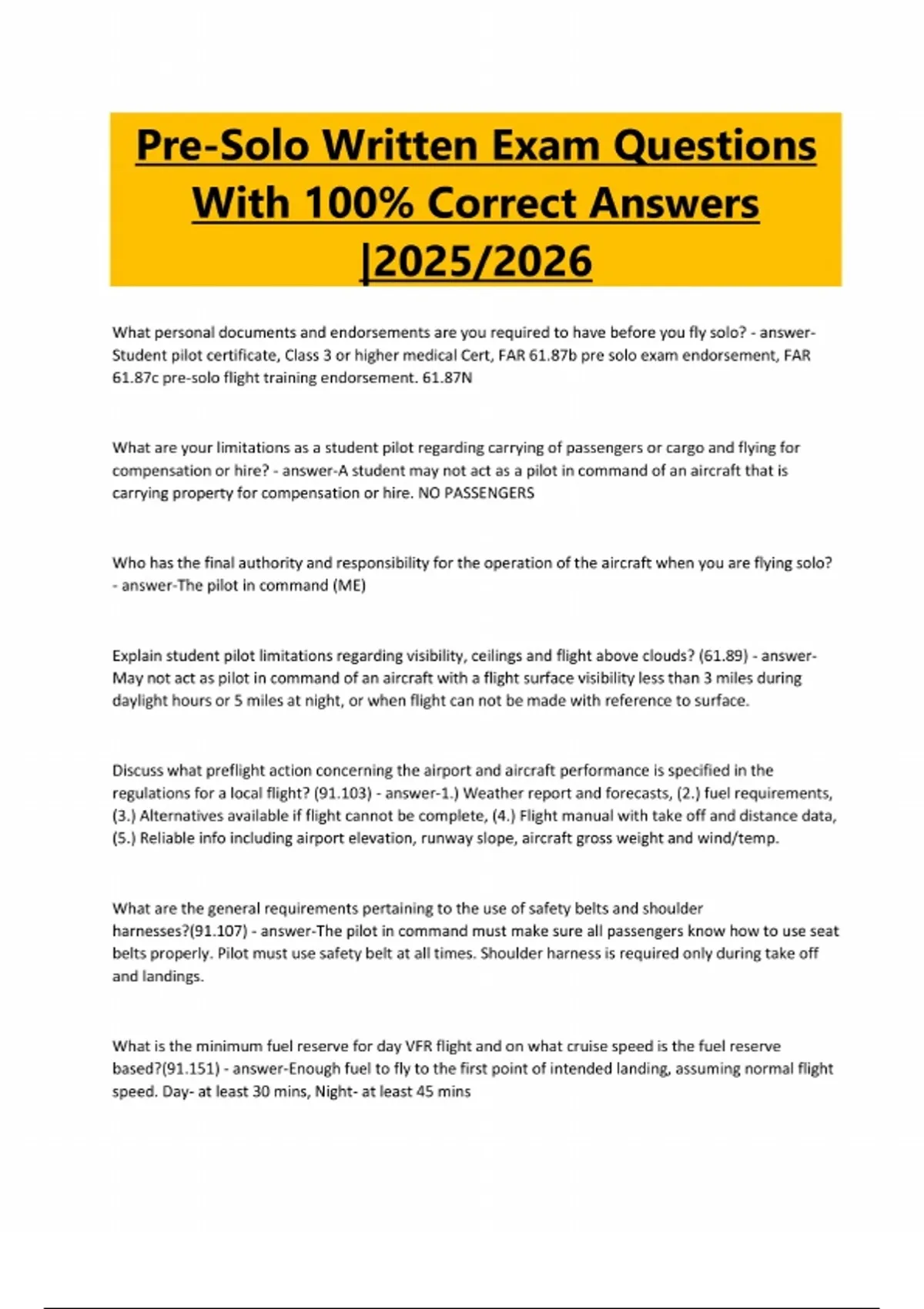 Pre-Solo Written Exam Questions With 100% Correct Answers |2025/2026 What personal documents and endorsements are you required to have before you fly solo? - answer Student pilot certificate, Class 3 or higher medical Cert, FAR 61.87b pre solo exam endorsement, FAR 61.87c pre-solo flight training endorsement. 61.87N What are your limitations as a student pilot regarding carrying of passengers or cargo and flying for compensation or hire? - answer-A student may not act as a pilot in command of an aircraft that is carrying property for compensation or hire. NO PASSENGERS Who has the final authority and responsibility for the operation of the aircraft when you are flying solo? - answer-The pilot in command (ME) Explain student pilot limitations regarding visibility, ceilings and flight above clouds? (61.89) - answerMay not act as pilot in command of an aircraft with a flight surface visibility less than 3 miles during daylight hours or 5 miles at night, or when flight can not be made with reference to surface. Discuss what preflight action concerning the airport and aircraft performance is specified in the regulations for a local flight? (91.103) - answer-1.) Weather report and forecasts, (2.) fuel requirements, (3.) Alternatives available if flight cannot be complete, (4.) Flight manual with take off and distance data, (5.) Reliable info including airport elevation, runway slope, aircraft gross weight and wind/temp. What are the general requirements pertaining to the use of safety belts and shoulder harnesses?(91.107) - answer-The pilot in command must make sure all passengers know how to use seat belts properly. Pilot must use safety belt at all times. Shoulder harness is required only during take off and landings. What is the minimum fuel reserve for day VFR flight and on what cruise speed is the fuel reserve based?(91.151) - answer-Enough fuel to fly to the first point of intended landing, assuming normal flight speed. Day- at least 30 mins, Night- at least 45 mins