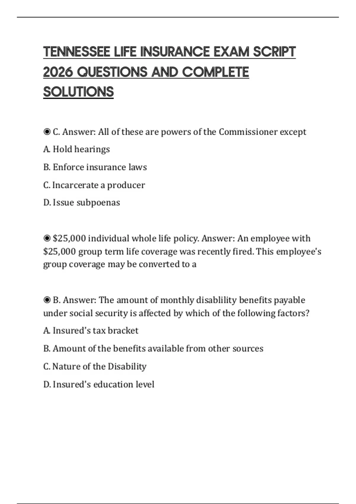 ◉ B. Answer: Which of the following types of policies pays a benefit
