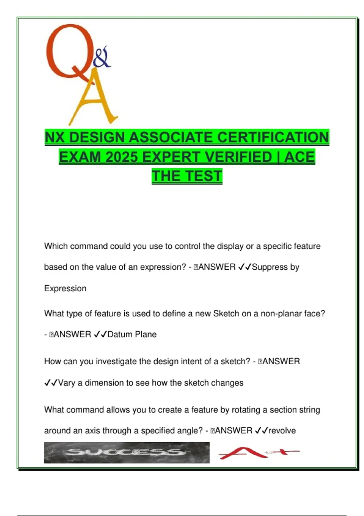 This expertly verified document contains over 250 multiple-choice questions and answers specifically tailored for the NX Design Associate Certification Exam 2025. Developed for students, engineers, and professionals pursuing Siemens NX certification, this resource provides full coverage of exam-relevant topics including parametric modeling, expressions, feature editing, assemblies, synchronous modeling, drafting, and design intent. The answers are accurate, concise, and match official certification standards—ideal for serious preparation. Topics covered include: Feature creation (Revolve, Extrude, Hole, Chamfer, Shell) Expressions, conditions, locking formulas, and design intent Synchronous modeling (Move Face, Resize Blend, Offset Region, Edit Cross Section) Assemblies (Bottom-Up design, reference sets, constraints, Work Part) Drafting techniques (projected views, title blocks, dimensioning) Model diagnostics (Part Navigator, visual tags, feature warnings) Advanced commands (Helix, Studio Spline, Variational Sweep, Product Outlines) This exam prep document is essential for students and professionals in: Mechanical Engineering CAD/CAM/CAE Training Industrial and Product Design Aerospace and Automotive Design Engineering Certification Programs Whether you're preparing for the NX Design Associate certification or refining your command of Siemens NX tools, this guide serves as a reliable, in-depth reference. Keywords: NX Design Associate, Siemens NX exam, NX certification, synchronous modeling, Move Face, Resize Blend, Offset Region, assemblies, drafting, parametric modeling, expressions, Part Navigator, feature suppression, design intent, bottom-up modeling, Work Part, constraints, PMI, CAD exam prep, technical drafting, shell command, sweep, boolean operations, sketching, datum plane, visual reporting, Helix, Studio Spline, master model, engineering certification