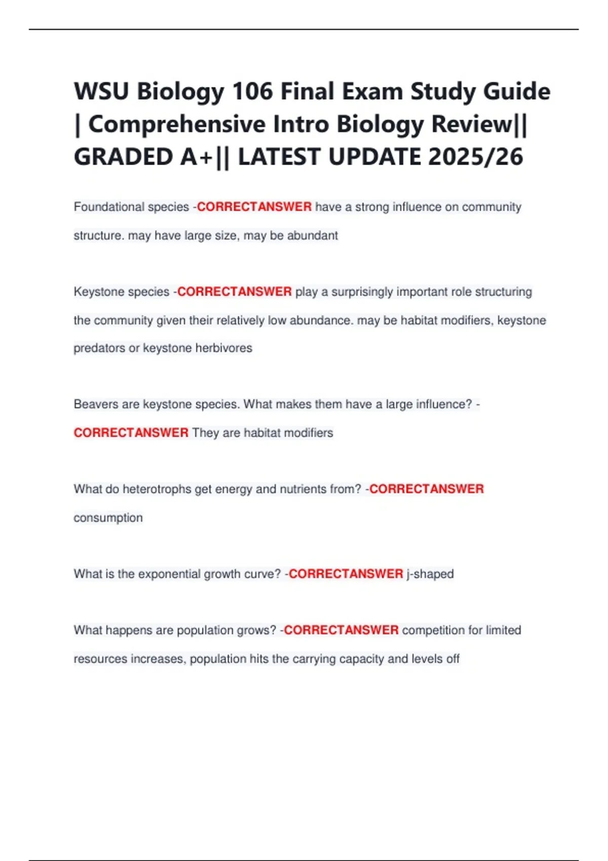 WSU Biology 106 Final Exam Study Guide | Comprehensive Intro Biology Review|| GRADED A+|| LATEST UPDATE 2025/26