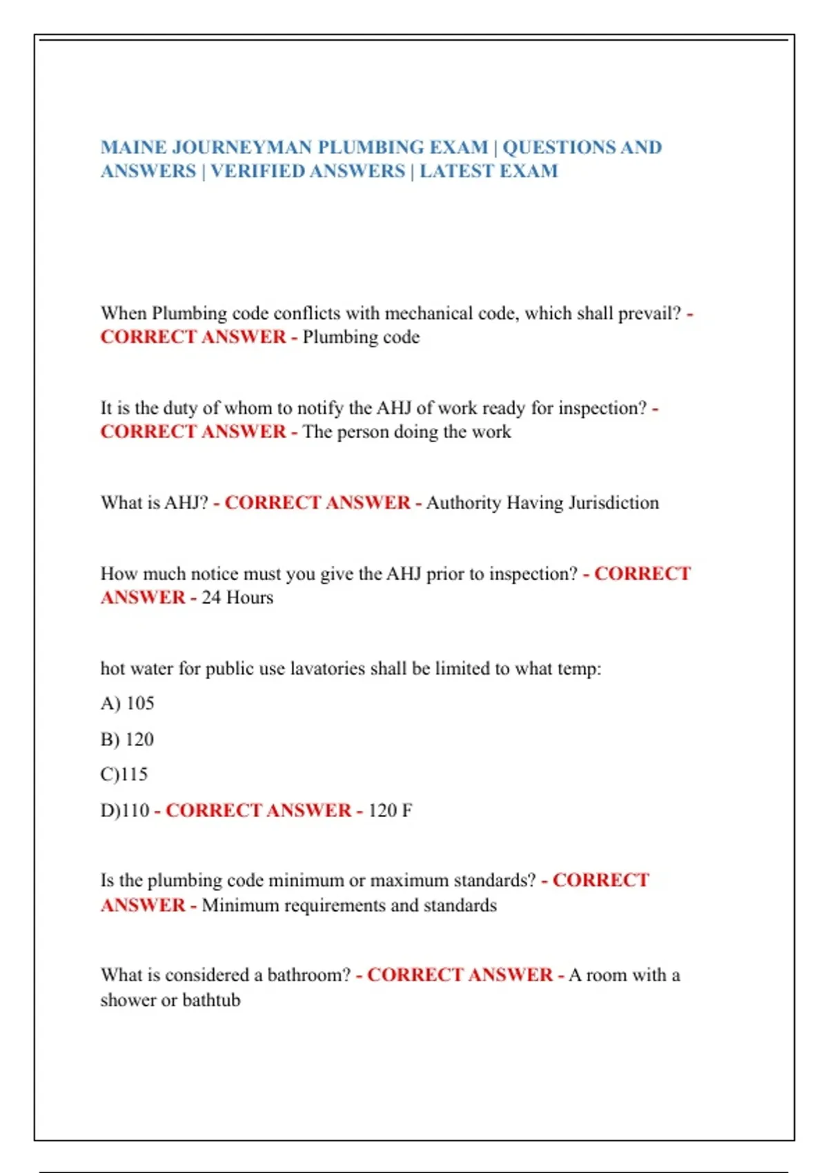 MAINE JOURNEYMAN PLUMBING EXAM | QUESTIONS AND ANSWERS | VERIFIED ANSWERS | LATEST EXAM