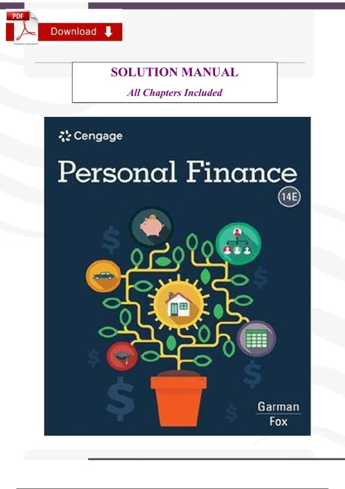 This Solution Manual for Personal Finance, 14th Edition by E. Thomas Garman and Raymond E. Forgue provides complete, step-by-step solutions to all end-of-chapter questions and problems. Perfect for students, instructors, and anyone studying personal finance, this manual helps clarify concepts and ensures full understanding of course material. Included in this solution manual: Fully worked solutions for numerical and analytical problems Detailed explanations for personal budgeting, credit management, consumer decisions, taxes, investments, retirement planning & insurance Clear calculations and financial decision-making models Support for assignments, quizzes, homework sets, and exam preparation Accurate solutions aligned with the 14th Edition textbook This is an essential resource for mastering financial literacy concepts and improving academic performance in personal finance courses.