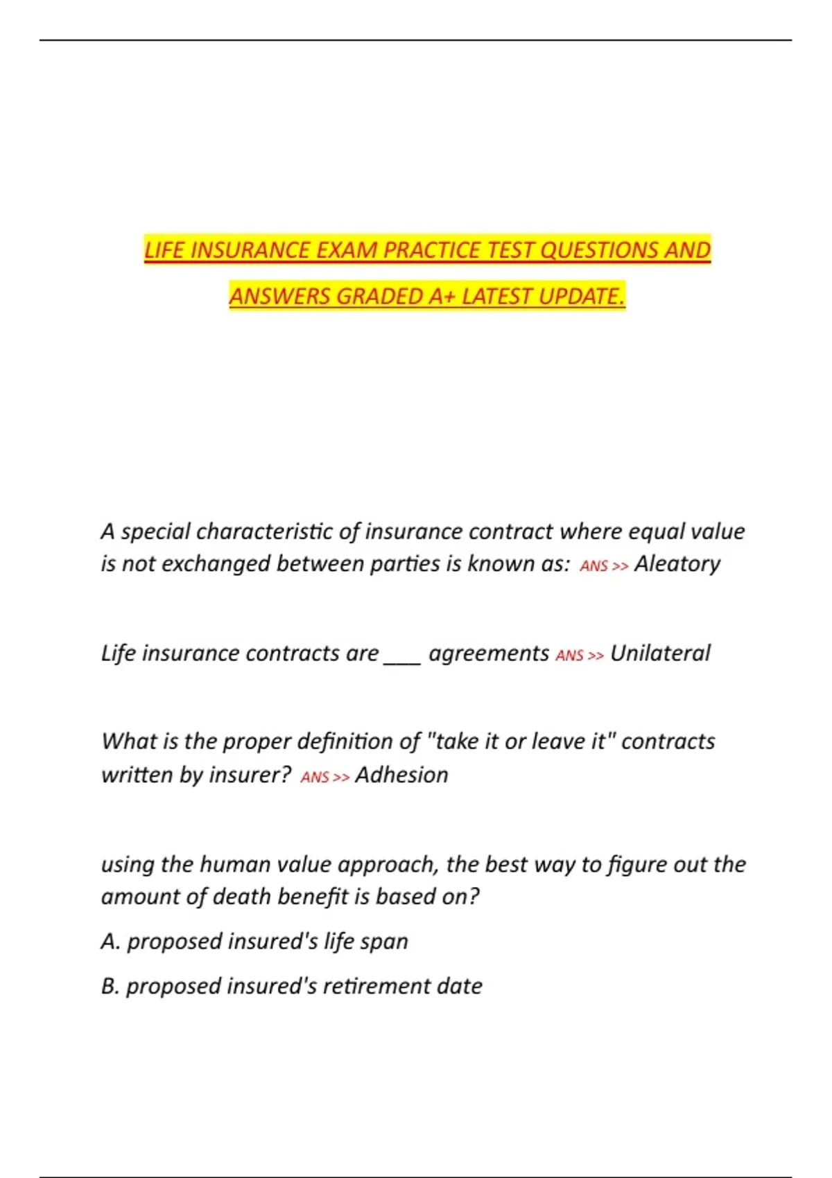 This document provides a complete set of life insurance practice test questions with fully graded A+ answers. It covers all major exam topics, including policy types, underwriting, risk assessment, premiums, beneficiaries, riders, and regulatory requirements. The material is updated to reflect the latest exam content and is structured to support thorough and effective preparation.