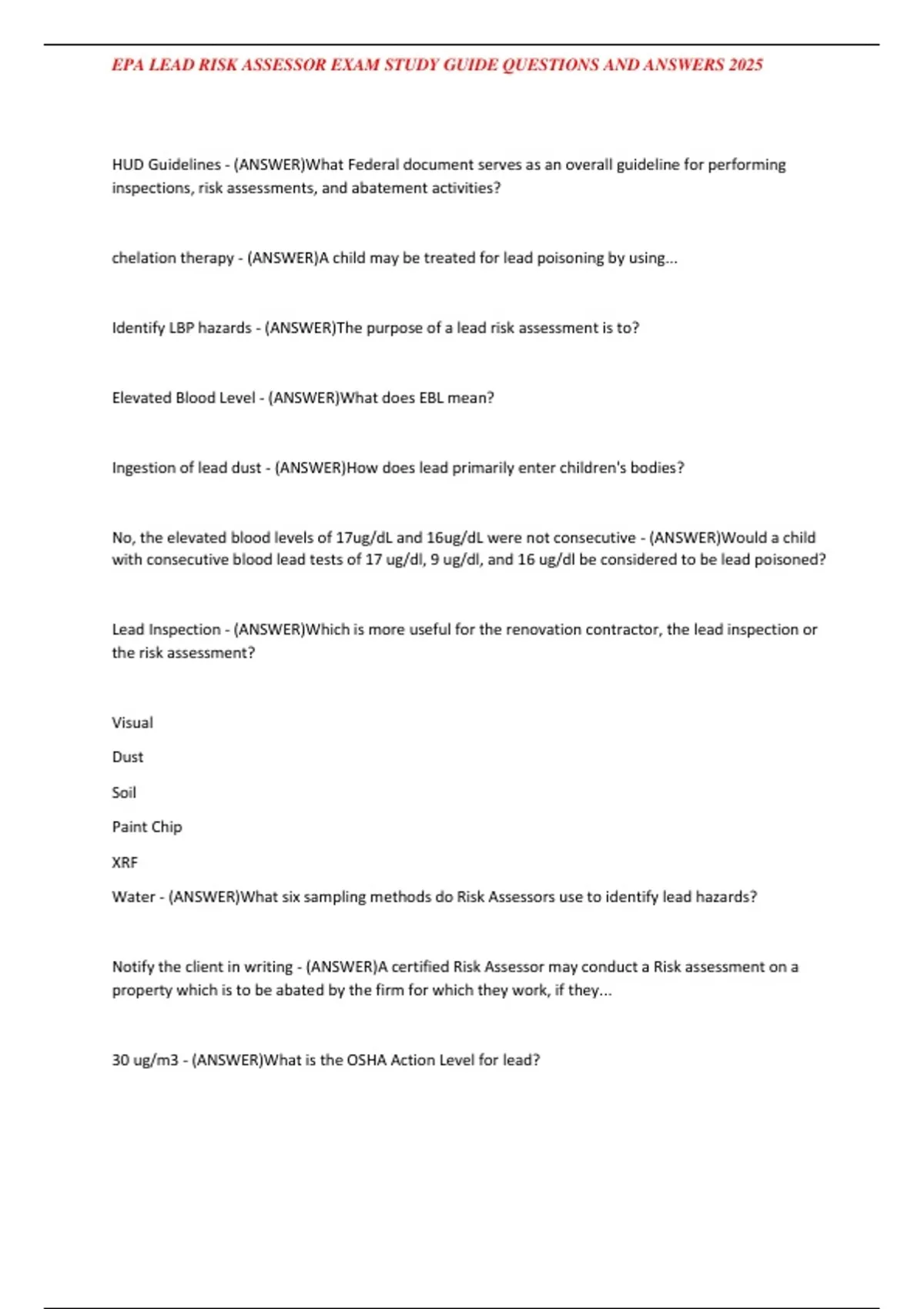 ,EPA LEAD RISK ASSESSOR EXAM STUDY GUIDE QUESTIONS AND ANSWERS 2025
