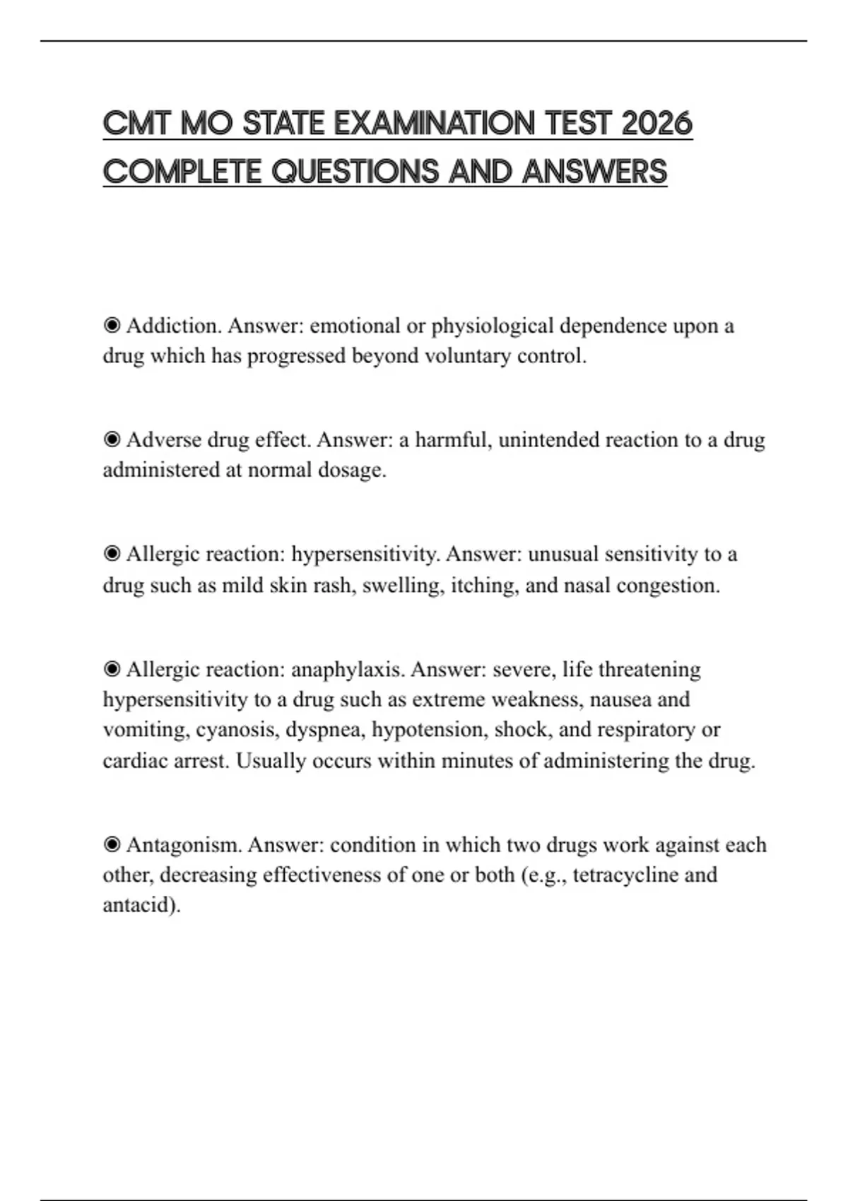 ◉ Adverse drug effect. Answer: a harmful, unintended reaction to a drug