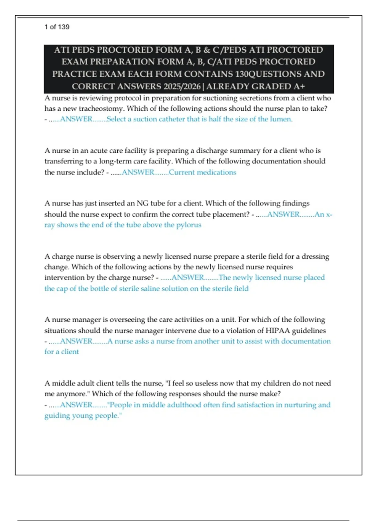 EXAM PREPARATION FORM A, B, C/ATI PEDS PROCTORED