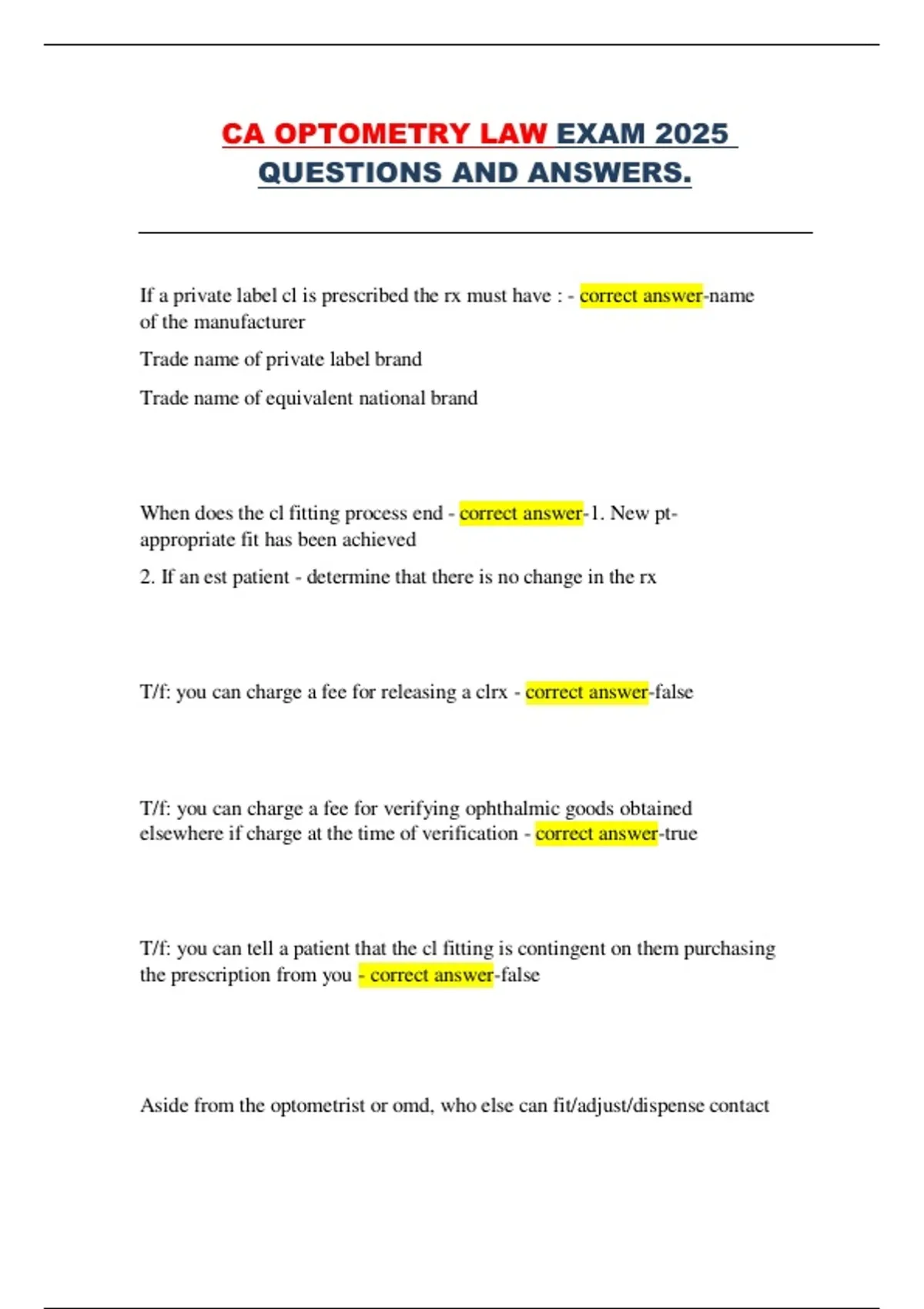 This document provides the full collection of 2025 California Optometry Law Exam questions with their correct answers. It covers scope of practice, contact lens and spectacle lens regulations, TPA certification rules, advertising restrictions, disciplinary actions, licensure requirements, CE rules, corporate practice laws, record-keeping requirements, mandated reporting, and California-specific optometry statutes. It serves as a comprehensive and detailed exam-preparation resource designed to help candidates review all legal and regulatory topics required for the California Optometry Law Exam.