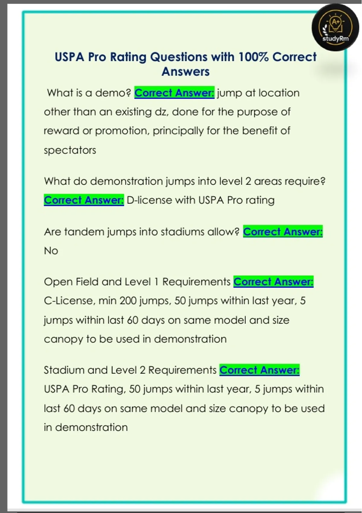 USPA Pro Rating Questions with 100% Correct Answers USPA Pro Rating Questions with 100% Correct Answers