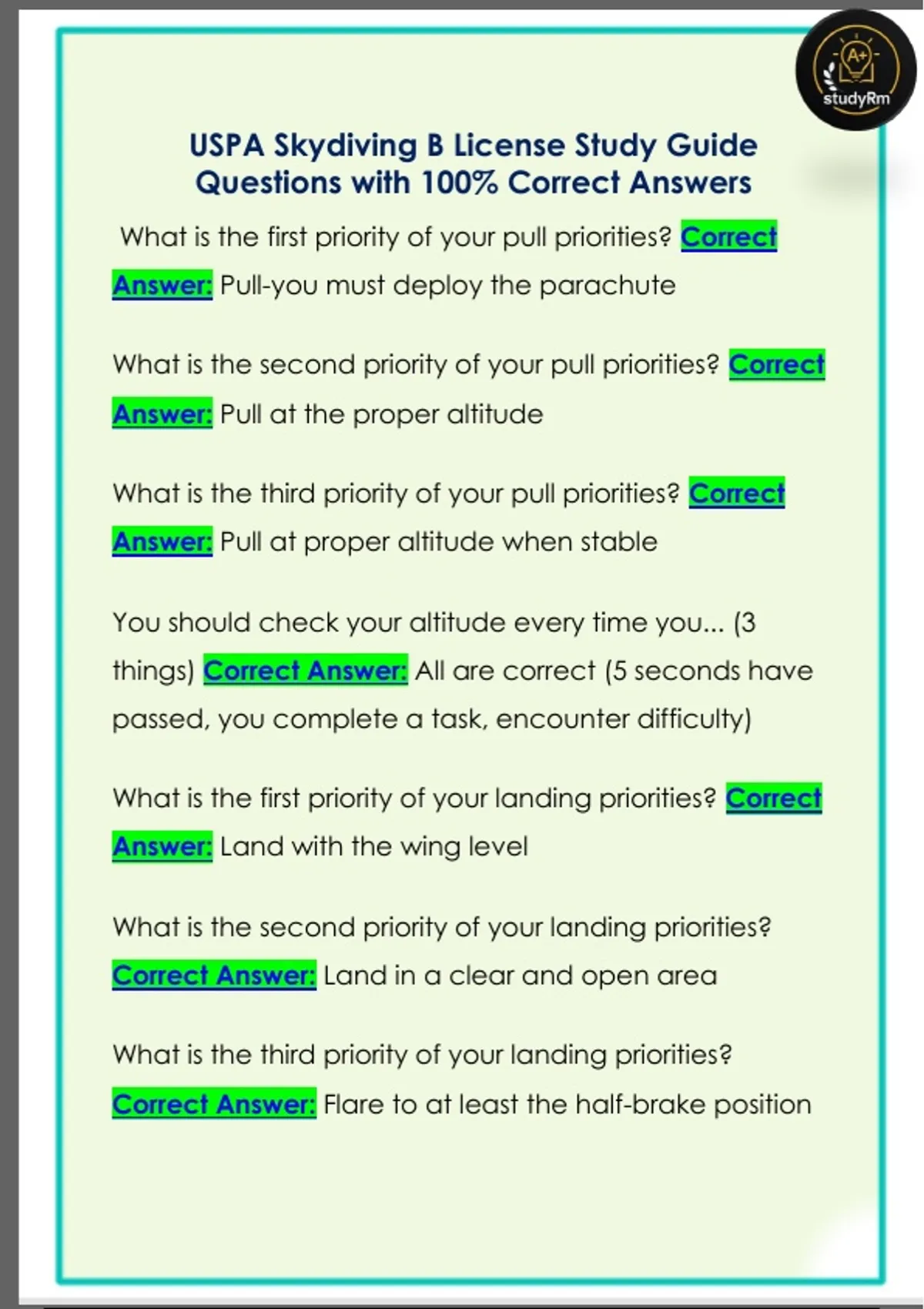 USPA Skydiving B License Study Guide Questions with 100% Correct Answers USPA Skydiving B License Study Guide Questions with 100% Correct Answers