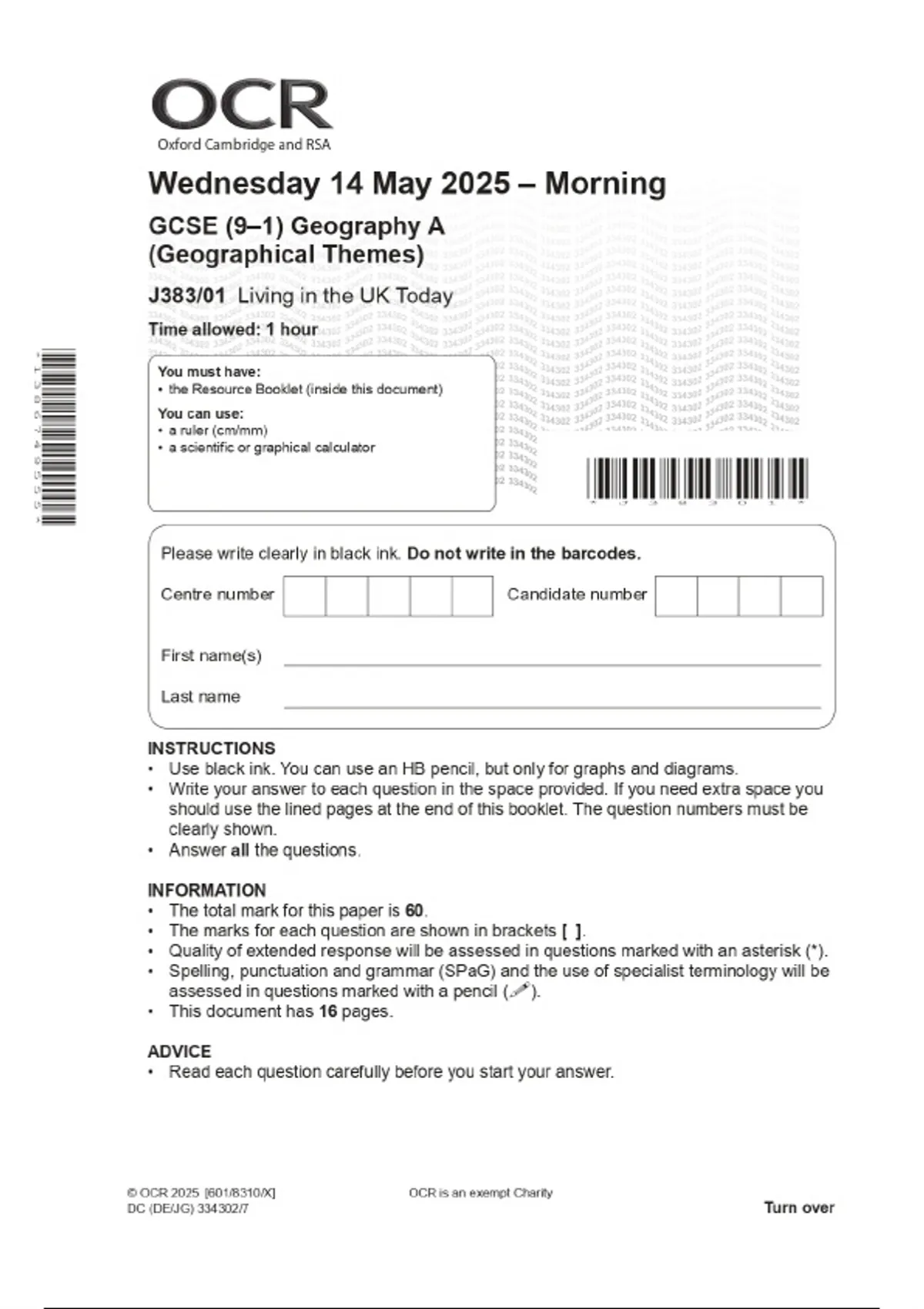 2025 OCR GCSE (9–1) Geography A (Geographical Themes) J383/01 Living in the UK Today Combined Question Paper & Final Marking Scheme
