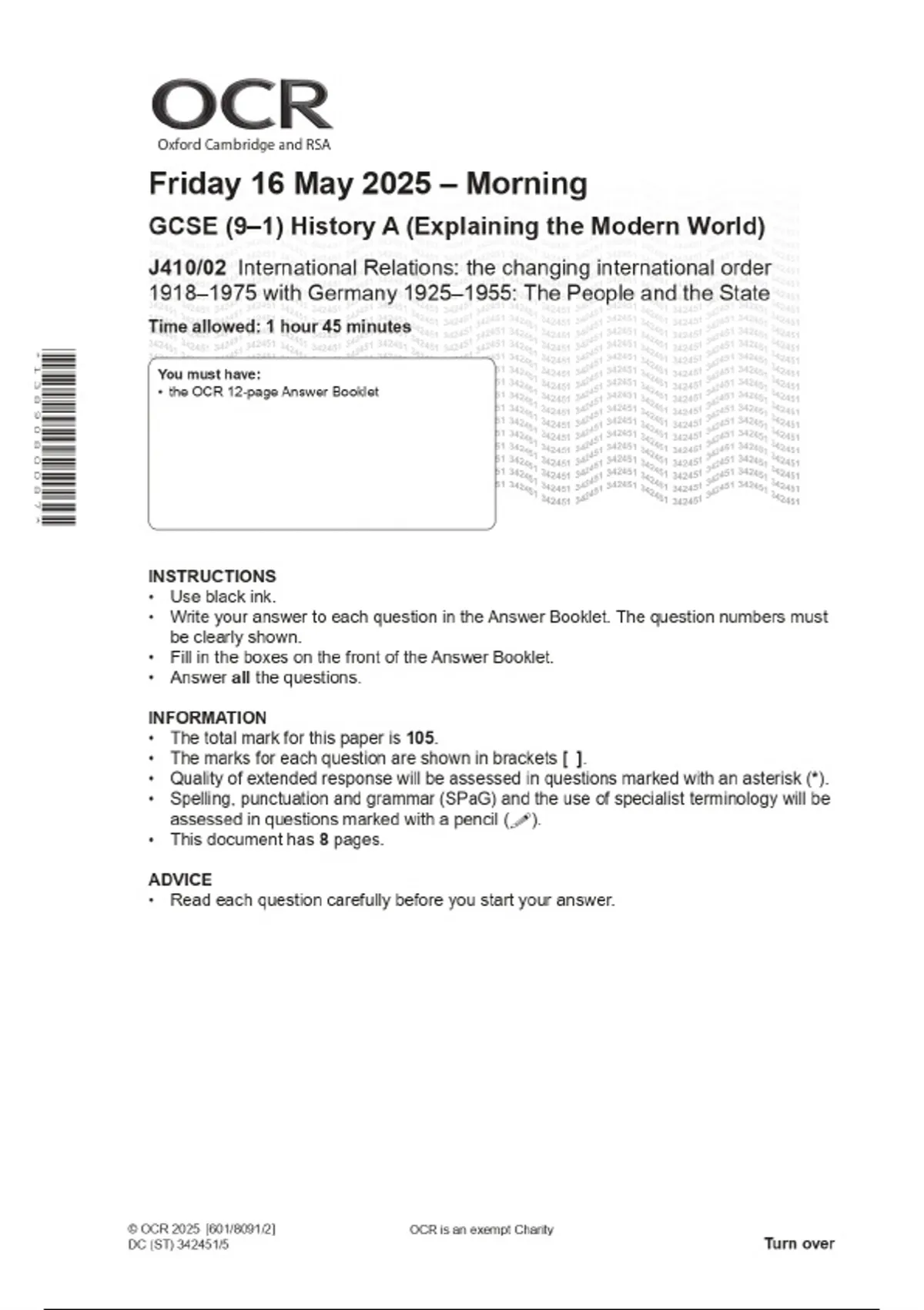 2025 OCR GCSE (9–1) History A (Explaining the Modern World) J410/02 International Relations: the changing international order 1918–1975 with Germany 1925–1955: The People and the State Combined Question Paper & Final Marking Scheme