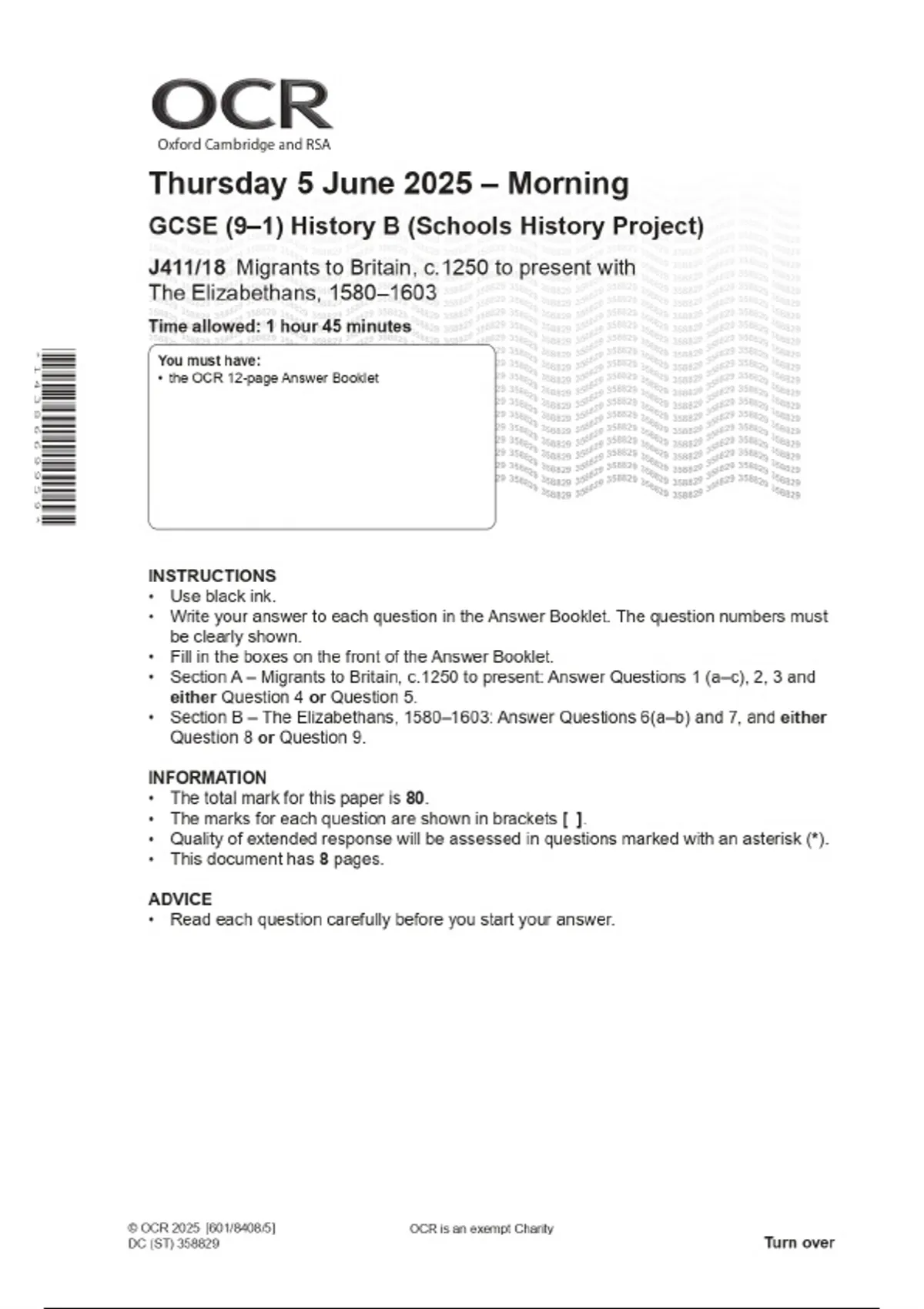 2025 OCR GCSE (9–1) History B (Schools History Project) J411/18 Migrants to Britain, c.1250 to present with The Elizabethans, 1580–1603 Combined Question Paper & Final Marking Scheme