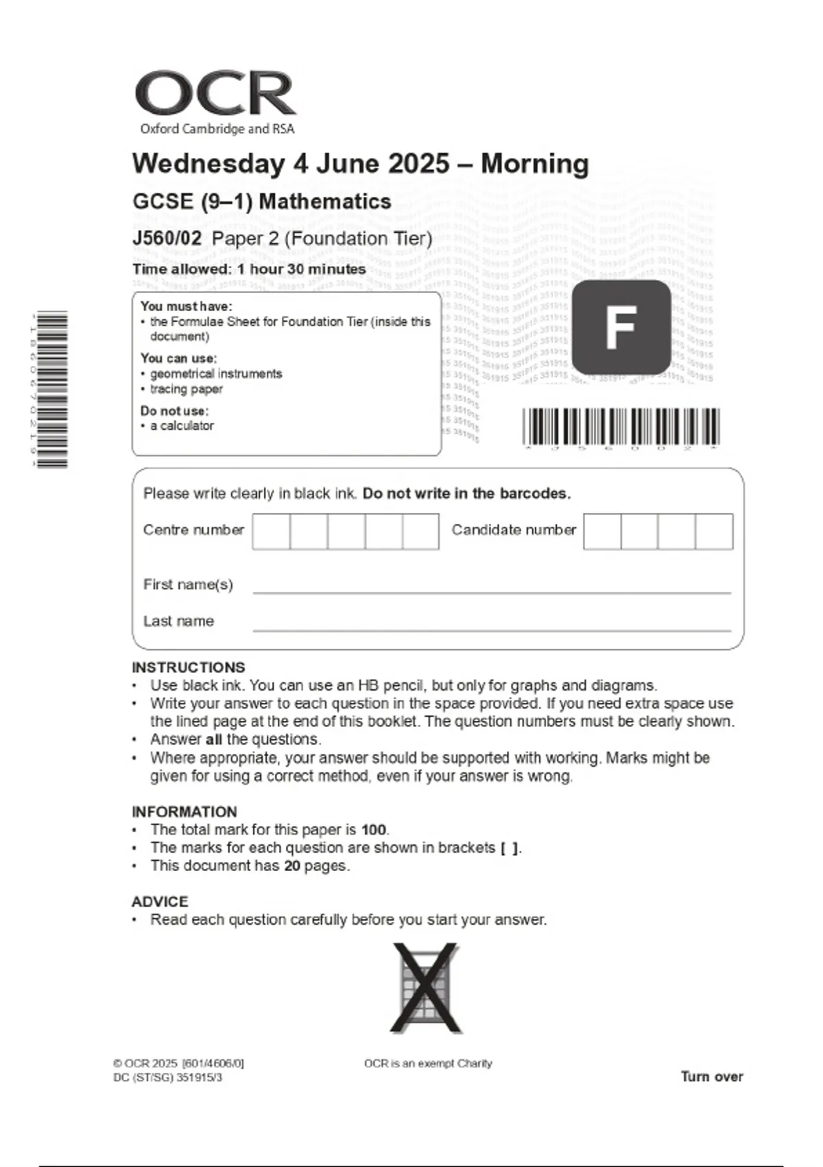 2025 OCR GCSE (9–1) Mathematics J560/02 Paper 2 (Foundation Tier) Combined Question Paper & Final Marking Scheme