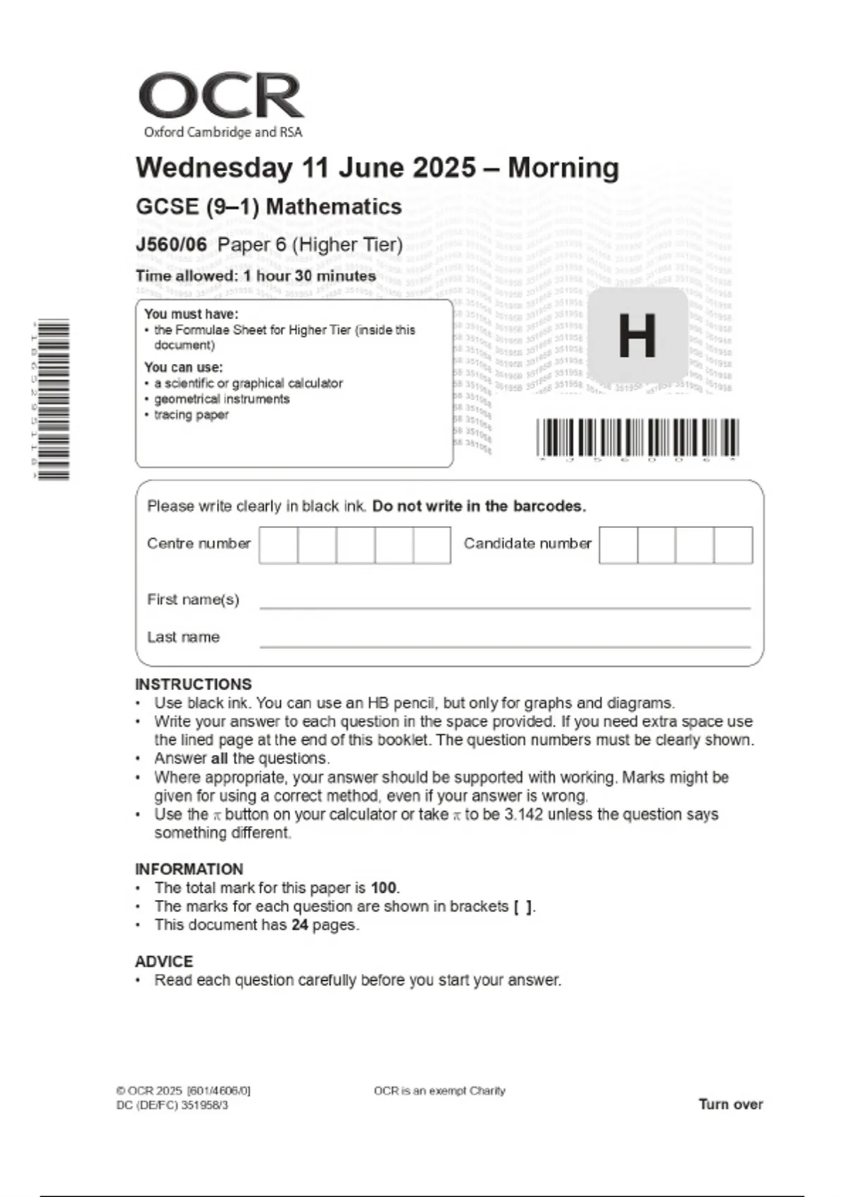 2025 ocr gcse 91 mathematics j56006 paper 6 h