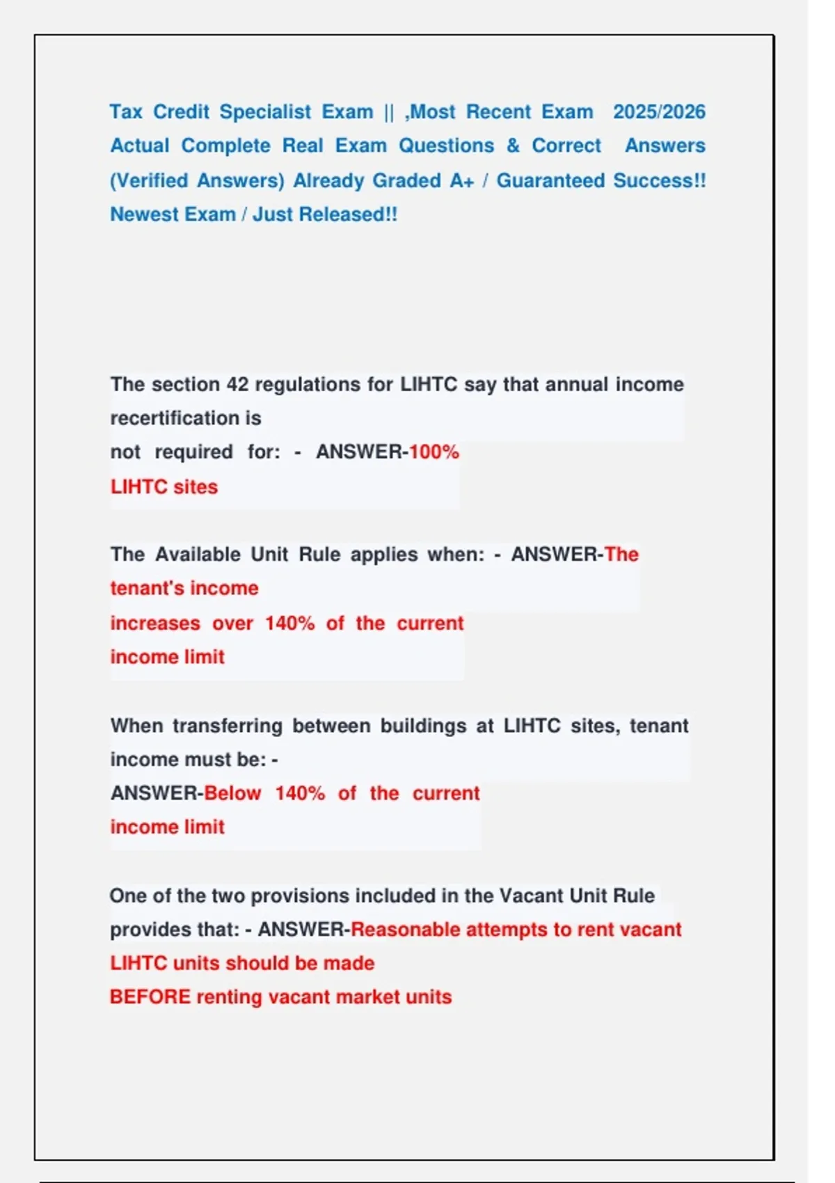 Tax Credit Specialist Exam || ,Most Recent Exam 2025/2026 Actual Complete Real Exam Questions & Correct Answers (Verified Answers) Already Graded A+ / Guaranteed Success!! Newest Exam / Just Released!! Tax Credit Specialist Exam || ,Most Recent Exam 2025/2026 Actual Complete Real Exam Questions & Correct Answers (Verified Answers) Already Graded A+ / Guaranteed Success!! Newest Exam / Just Released!! Tax Credit Specialist Exam || ,Most Recent Exam 2025/2026 Actual Complete Real Exam Questions & Correct Answers (Verified Answers) Already Graded A+ / Guaranteed Success!! Newest Exam / Just Released!! Tax Credit Specialist Exam || ,Most Recent Exam 2025/2026 Actual Complete Real Exam Questions & Correct Answers (Verified Answers) Already Graded A+ / Guaranteed Success!! Newest Exam / Just Released!! Tax Credit Specialist Exam || ,Most Recent Exam 2025/2026 Actual Complete Real Exam Questions & Correct Answers (Verified Answers) Already Graded A+ / Guaranteed Success!! Newest Exam / Just Released!! Tax Credit Specialist Exam || ,Most Recent Exam 2025/2026 Actual Complete Real Exam Questions & Correct Answers (Verified Answers) Already Graded A+ / Guaranteed Success!! Newest Exam / Just Released!!