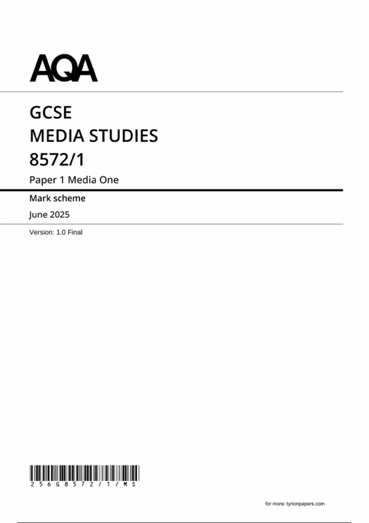 2025 AQA GCSE MEDIA STUDIES Mark Scheme Paper 1 (8572/1: Media One)