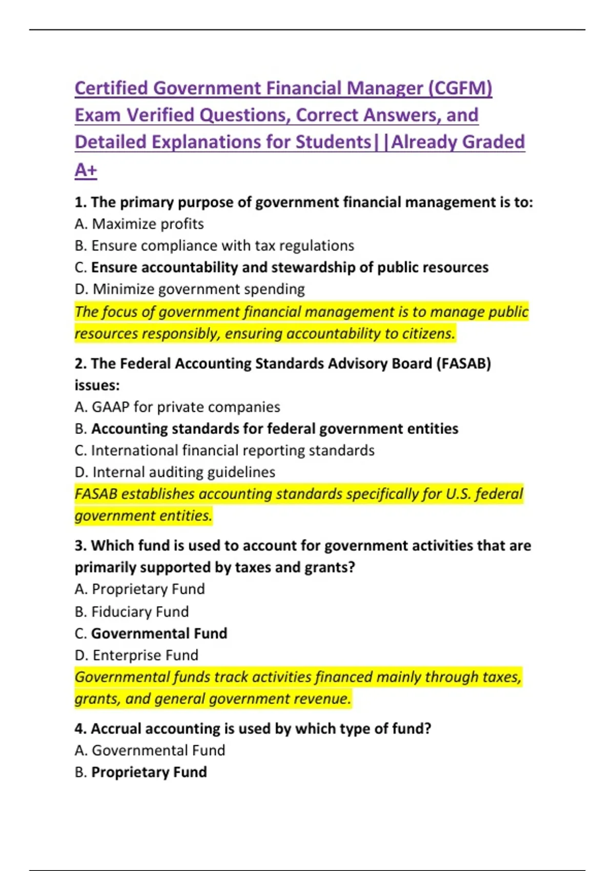 Certified Government Financial Manager (CGFM) Exam Verified Questions, Correct Answers, and Detailed Explanations for Students||Already Graded A+