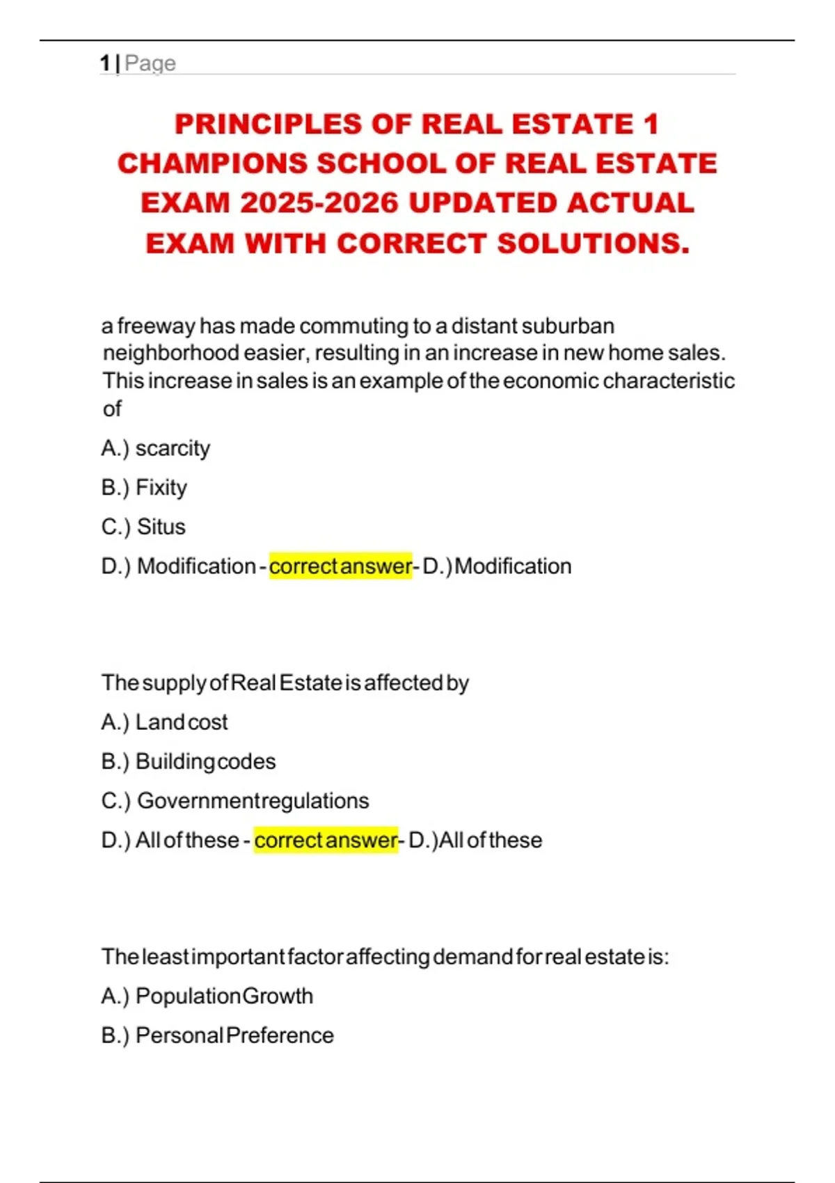 PRINCIPLES OF REAL ESTATE 1 CHAMPIONS SCHOOL OF REAL ESTATE EXAM UPDATED ACTUAL EXAM WITH CORRECT SOLUTIONS.