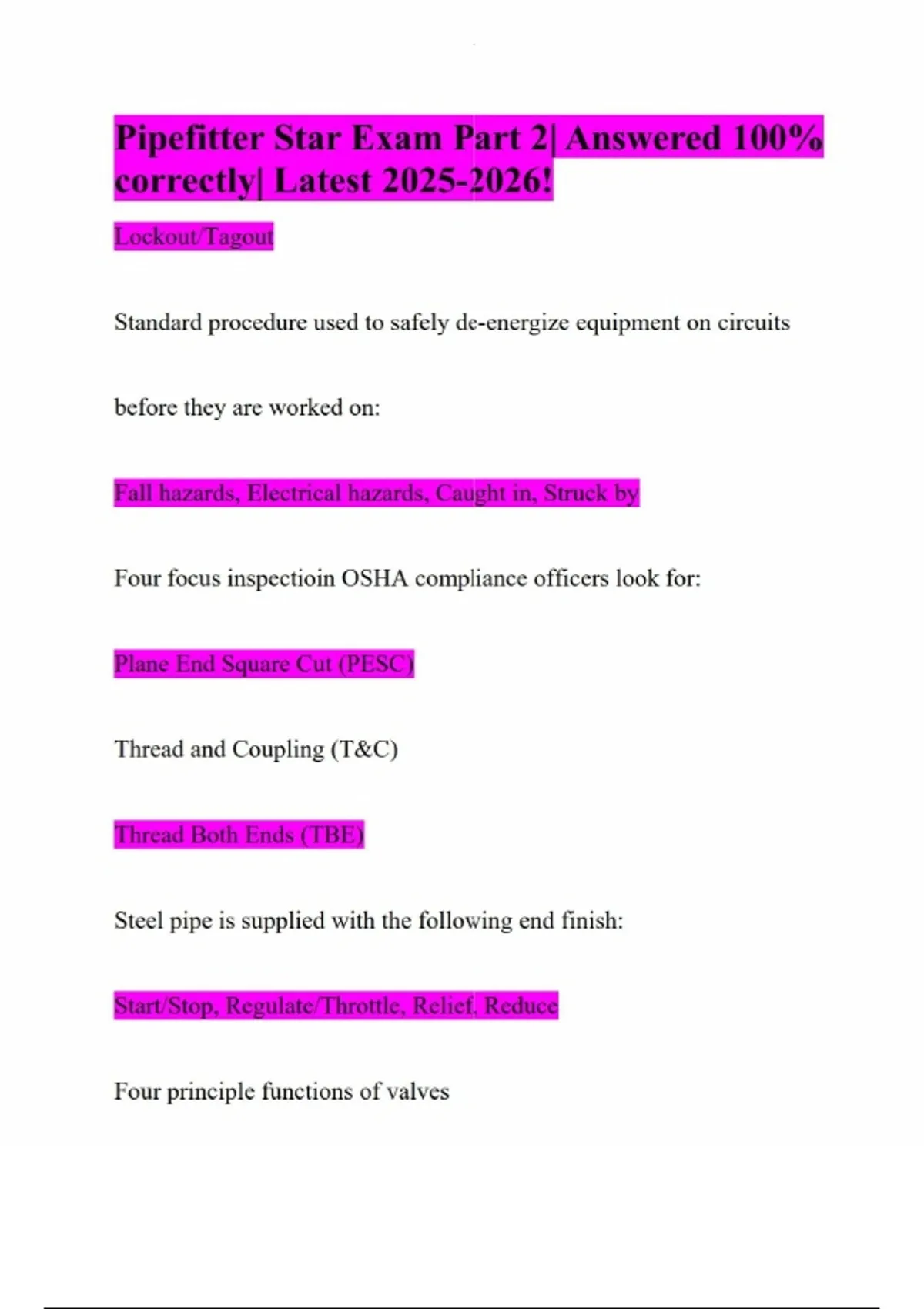 Pipefitter Star Exam Part 2| Answered 100% correctly| Latest ! Lockout/Tagout Standard procedure used to safely de-energize equipment on circuits before they are worked on: Fall hazards, Electrical hazards, Caught in, Struck by Four focus inspectioin OSHA compliance officers look for: Plane End Square Cut (PESC) Thread and Coupling (T&C) Thread Both Ends (TBE) Steel pipe is supplied with the following end finish: Start/Stop, Regulate/Throttle, Relief, Reduce Four principle functions of valves 125F Never expose any part of a compressed gas cylinder to temperatures above: 350F Max service temperature of a brazed joint? Straight, Choker, Basket Three basic hitches which can be used for lifting with a sling 6300F Oxyacetylene flame has a peak temperature of roughly: Immediate danger to Live and Health IDLH in regards to OSHA stands for Inhalation, ingestion, absorption, and injection. Four routes of entry into the human body are Are impelled along a conductor When voltage is applied along a conductor, free electrons: Exists at all points along it's length The magnetic field around a current carrying wire: Voltage/Amps What is the formula for electrical resistance (ohms) Thermocouple A ________ generates a small amount of voltage when heated. Sensible heat The quantity of heat involved to change a substance that can be measured with a thermometer.