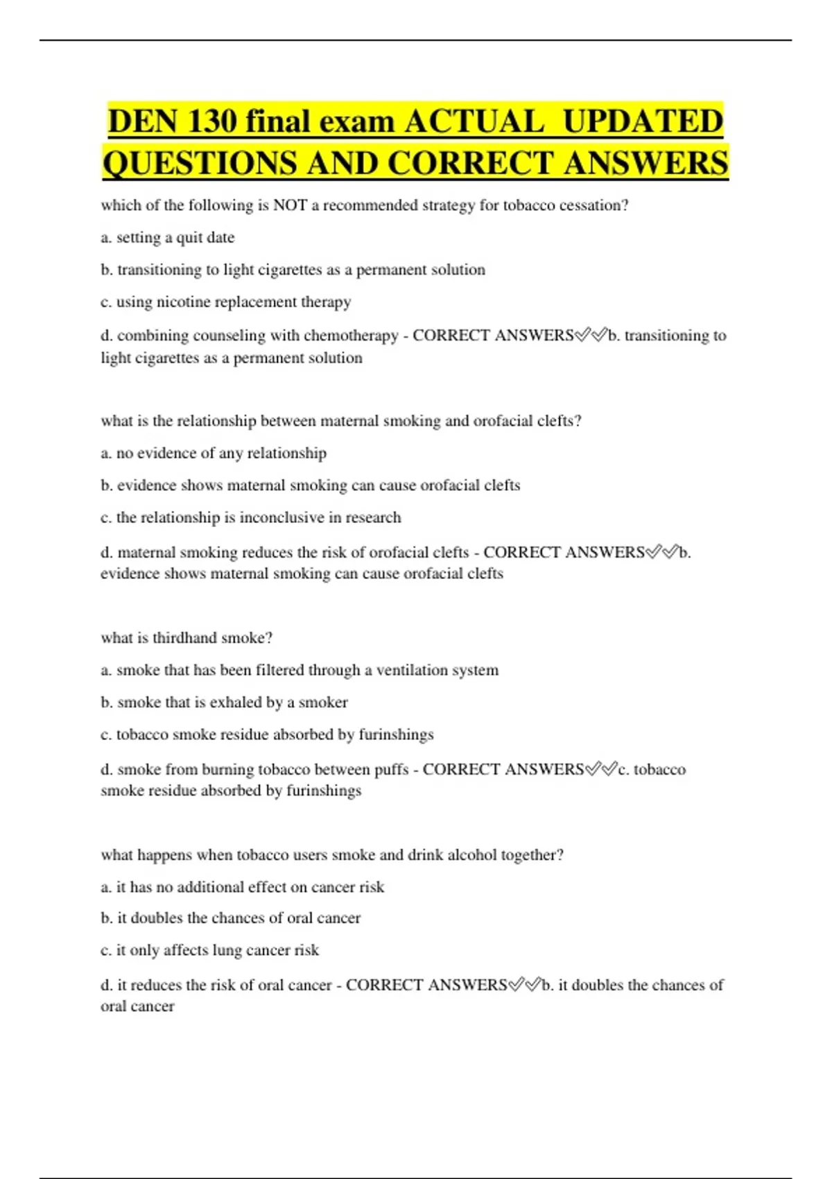 DEN 130 final exam ACTUAL UPDATED QUESTIONS AND CORRECT ANSWERS which of the following is NOT a recommended strategy for tobacco cessation? a. setting a quit date b. transitioning to light cigarettes as a permanent solution c. using nicotine replacement therapy d. combining counseling with chemotherapy - CORRECT ANSWERSb. transitioning to light cigarettes as a permanent solution what is the relationship between maternal smoking and orofacial clefts? a. no evidence of any relationship b. evidence shows maternal smoking can cause orofacial clefts c. the relationship is inconclusive in research d. maternal smoking reduces the risk of orofacial clefts - CORRECT ANSWERSb. evidence shows maternal smoking can cause orofacial clefts what is thirdhand smoke? a. smoke that has been filtered through a ventilation system b. smoke that is exhaled by a smoker c. tobacco smoke residue absorbed by furinshings d. smoke from burning tobacco between puffs - CORRECT ANSWERSc. tobacco smoke residue absorbed by furinshings what happens when tobacco users smoke and drink alcohol together? a. it has no additional effect on cancer risk b. it doubles the chances of oral cancer c. it only affects lung cancer risk d. it reduces the risk of oral cancer - CORRECT ANSWERSb. it doubles the chances of oral cancer what is the pattern of relapse for tobacco addiction compared to other substances. a. the pattern of relapse is identical for tobacco, alcohol, and heroin b. tobacco has a Lower relapse rate than other substances c. tobacco has a unique relapse pattern unlike other substances d. tobacco has a higher relapse rate than all other substances - CORRECT ANSWERSa. the pattern of relapse is identical for tobacco, alcohol, and heroin what is the chief psychoactive ingredient in tobacco that causes addiction? a. tar b. nicotine c. carbon monoxide d. acetaldehyde - CORRECT ANSWERSb. nicotine what are the 5 A's framework used for tobacco cessation intervention? a. analyze, address, advise, assist, assess b. ask, advise, attempt, assist, arrange c. ask, advise, assess, assist, arrange, - CORRECT ANSWERSc. ask, advise, assess