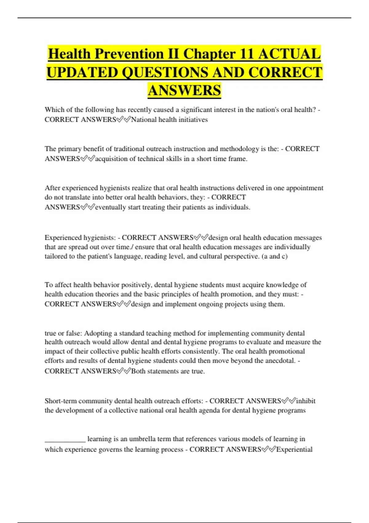 Health Prevention II Chapter 11 ACTUAL UPDATED QUESTIONS AND CORRECT ANSWERS Which of the following has recently caused a significant interest in the nation's oral health? - CORRECT ANSWERSNational health initiatives The primary benefit of traditional outreach instruction and methodology is the: - CORRECT ANSWERSacquisition of technical skills in a short time frame. After experienced hygienists realize that oral health instructions delivered in one appointment do not translate into better oral health behaviors, they: - CORRECT ANSWERSeventually start treating their patients as individuals. Experienced hygienists: - CORRECT ANSWERSdesign oral health education messages that are spread out over time./ ensure that oral health education messages are individually tailored to the patient's language, reading level, and cultural perspective. (a and c) To affect health behavior positively, dental hygiene students must acquire knowledge of health education theories and the basic principles of health promotion, and they must: - CORRECT ANSWERSdesign and implement ongoing projects using them. true or false: Adopting a standard teaching method for impleme
