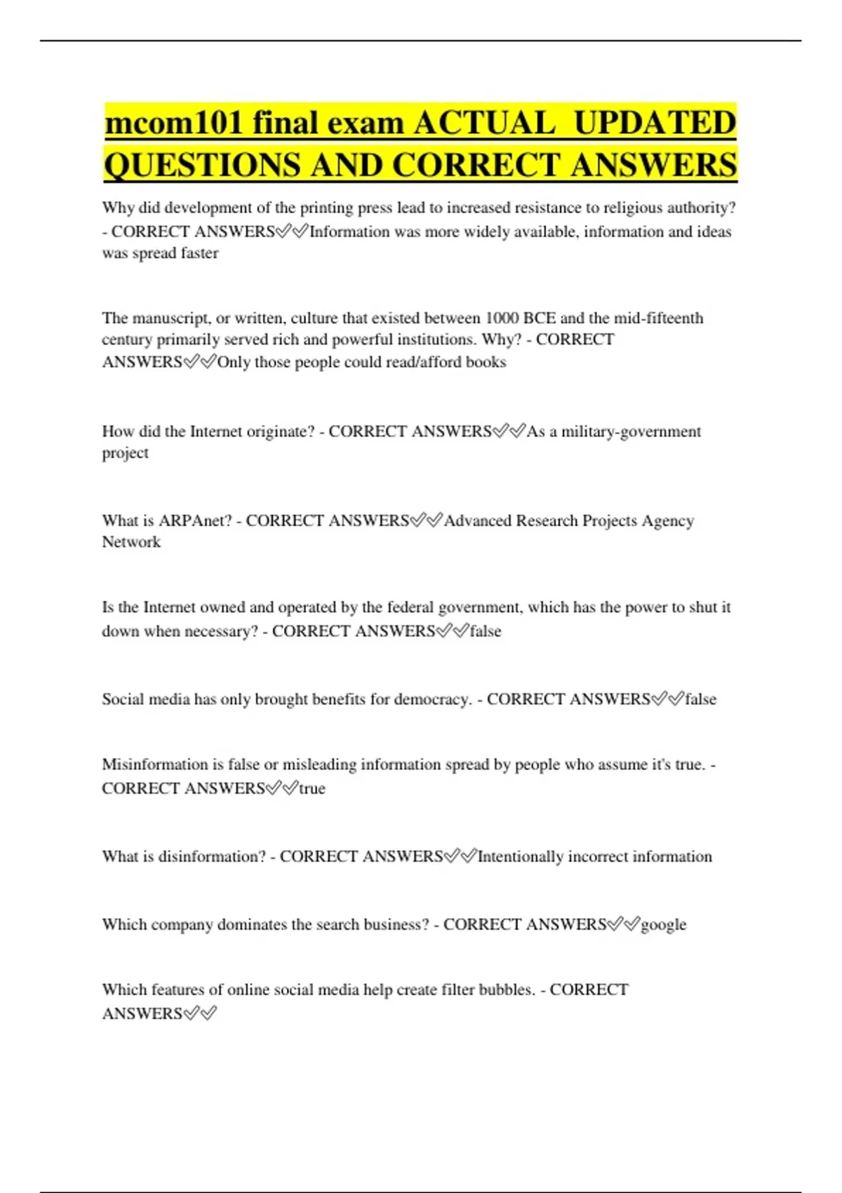 mcom101 final exam ACTUAL UPDATED QUESTIONS AND CORRECT ANSWERS Why did development of the printing press lead to increased resistance to religious authority? - CORRECT ANSWERSInformation was more widely available, information and ideas was spread faster The manuscript, or written, culture that existed between 1000 BCE and the mid-fifteenth century primarily served rich and powerful institutions. Why? - CORRECT ANSWERSOnly those people could read/afford books How did the Internet originate? - CORRECT ANSWERSAs a military-government project What is ARPAnet? - CORRECT ANSWERSAdvanced Research Projects Agency Network Is the Internet owned and operated by the federal government, which has the power to shut it down when necessary? - CORRECT ANSWERSfalse Social media has only brought benefits for democracy. - CORRECT ANSWERSfalse Misinformation is false or misleading information spread by people who assume it's true. - CORRECT ANSWERStrue What is disinformation? - CORRECT ANSWERSIntentionally incorrect information Which company dominates the search business? - CORRECT ANSWERSgoogle Which features of online social media help create filter bubbles. - CORRECT