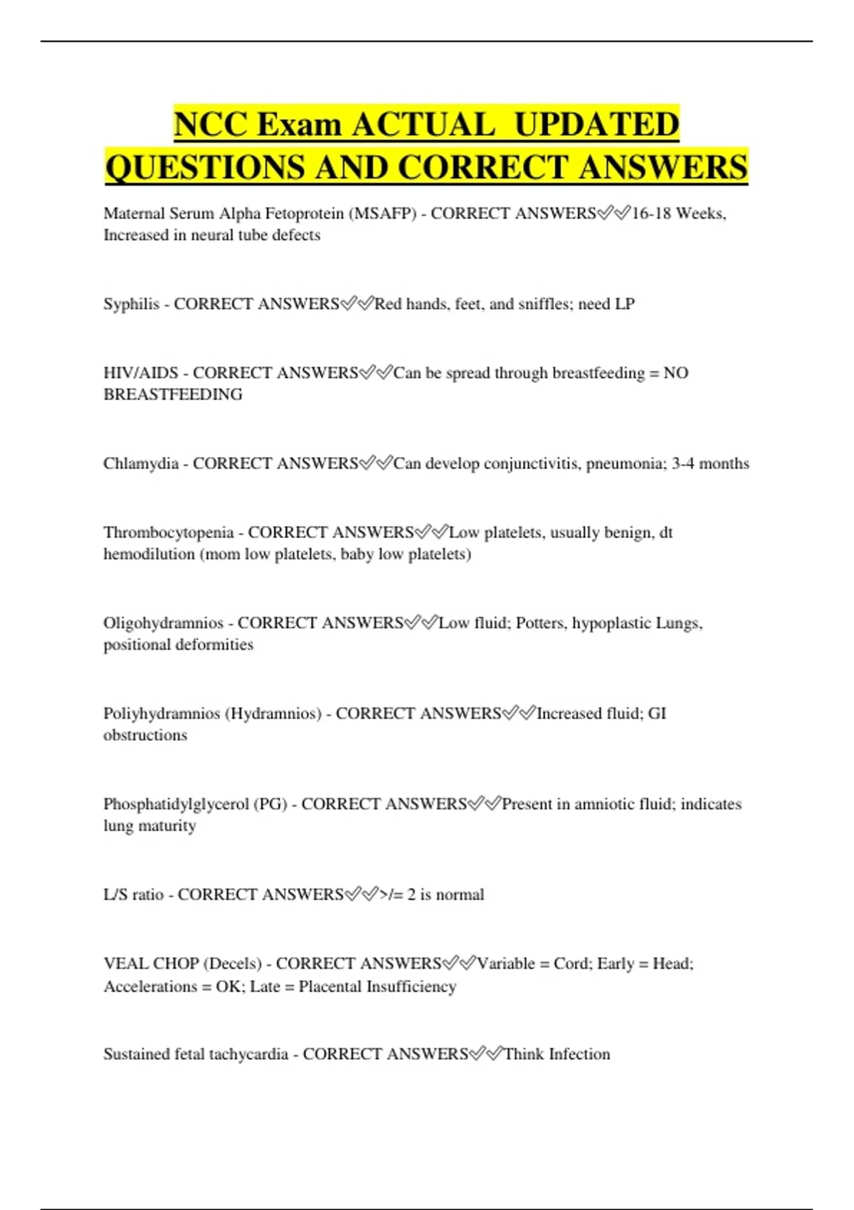 NCC Exam ACTUAL UPDATED QUESTIONS AND CORRECT ANSWERS Maternal Serum Alpha Fetoprotein (MSAFP) - CORRECT ANSWERS16-18 Weeks, Increased in neural tube defects Syphilis - CORRECT ANSWERSRed hands, feet, and sniffles; need LP HIV/AIDS - CORRECT ANSWERSCan be spread through breastfeeding = NO BREASTFEEDING Chlamydia - CORRECT ANSWERSCan develop conjunctivitis, pneumonia; 3-4 months Thrombocytopenia - CORRECT ANSWERSLow platelets, usually benign, dt hemodilution (mom low platelets, baby low platelets) Oligohydramnios - CORRECT ANSWERSLow fluid; Potters, hypoplastic Lungs, positional deformities Poliyhydramnios (Hydramnios) - CORRECT ANSWERSIncreased fluid;
