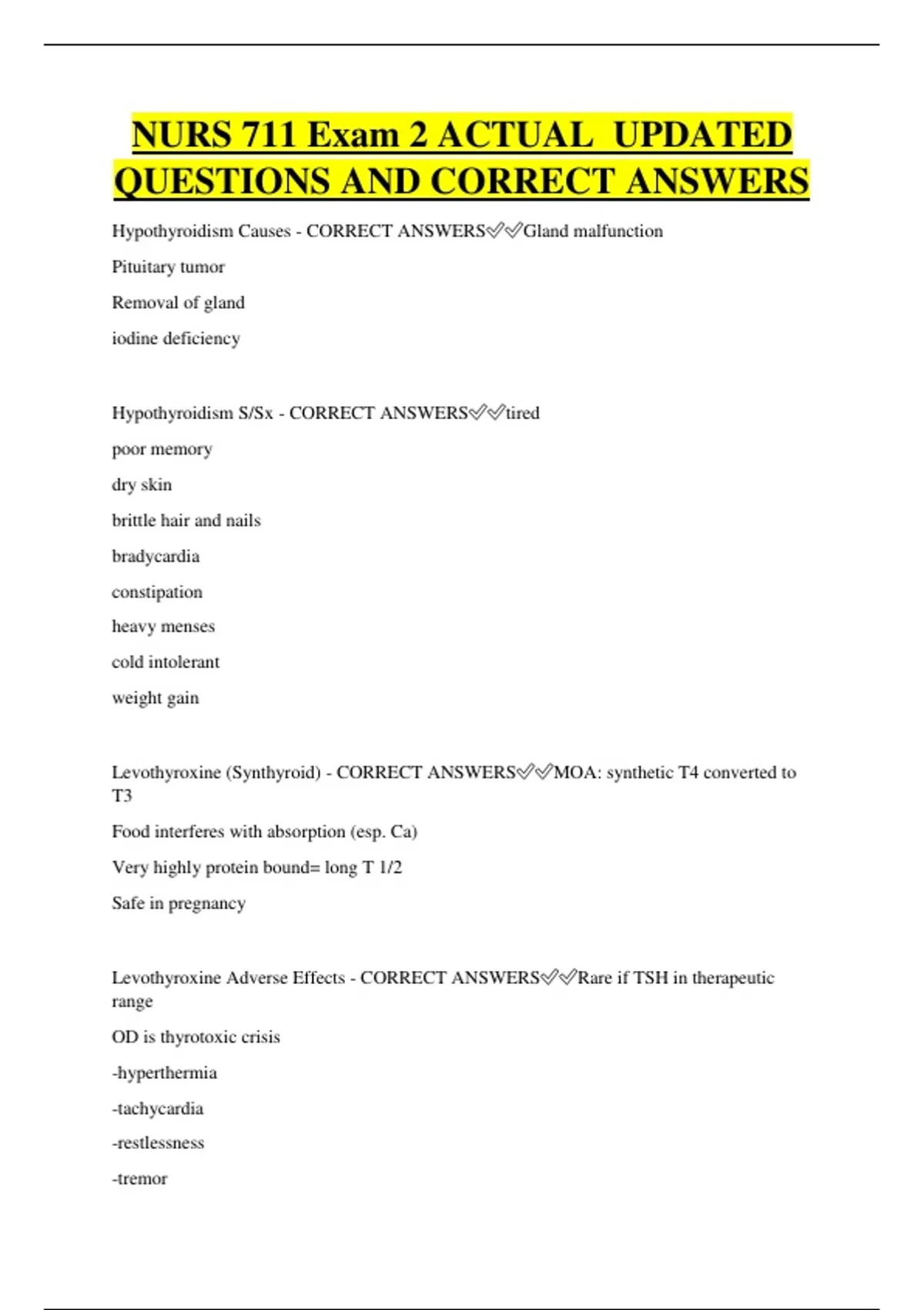 NURS 711 Exam 2 ACTUAL UPDATED QUESTIONS AND CORRECT ANSWERS Hypothyroidism Causes - CORRECT ANSWERSGland malfunction Pituitary tumor Removal of gland iodine deficiency Hypothyroidism S/Sx - CORRECT ANSWERStired poor memory dry skin brittle hair and nails bradycardia constipation heavy menses cold intolerant weight gain Levothyroxine (Synthyroid) - CORRECT ANSWERSMOA: synthetic T4 converted to T3 Food interferes with absorption (esp. Ca) Very highly protein bound= long T 1/2 Safe in pregnancy Levothyroxine Adverse Effects - CORRECT ANSWERSRare if TSH in therapeutic range OD is thyrotoxic crisis -hyperthermia -tachycardia -restlessness -tremor -weight loss Levothyroxine Pt Education - CORRECT ANSWERSTake early AM on empty stomach Generic/brand consistency Regular lab monitoring Report thyrotoxic symptoms Hyperthyroidism Causes - CORRECT ANSWERSGrave's Disease Toxic nodular goiter Hyperthyroidism S/Sx - CORRECT ANSWERSanxious