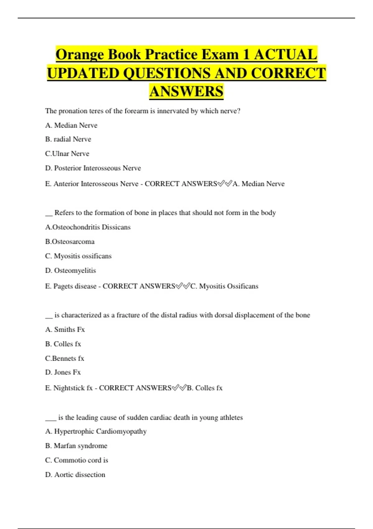 Orange Book Practice Exam 1 ACTUAL UPDATED QUESTIONS AND CORRECT ANSWERS The pronation teres of the forearm is innervated by which nerve? A. Median Nerve B. radial Nerve C.Ulnar Nerve D. Posterior Interosseous Nerve E. Anterior Interosseous Nerve - CORRECT ANSWERSA. Median Nerve __ Refers to the formation of bone in places that should not form in the body A.Osteochondritis Dissicans B.Osteosarcoma C. Myositis ossificans D. Osteomyelitis E. Pagets disease - CORRECT ANSWERSC. Myositis Ossificans __ is characterized as a fracture of the distal radius with dorsal displacement of the bone A. Smiths Fx B. Colles fx C.Bennets fx D. Jones Fx E. Nightstick fx - CORRECT ANSWERSB. Colles fx ___ is the leading cause of sudden cardiac death in young athletes A. Hypertrophic Cardiomyopathy B. Marfan syndrome C. Commotio cord is D. Aortic dissection E. Cardiac Temonade - CORRECT ANSWERSA. Hypertrophic Cardiomyopathy During the __ phase of healing, one should begin strengthening and neuromuscular control exercises. A. Inflammation B. Proliferation C. Remodeling D. Maturation E. All the above - CORRECT ANSWERSB. Proliferation During the __ technique of PNF, the patient voluntarily moves the limb with resistance, holds against isometric resistance, and relaxes while the agonist contracts. A. Contract- relax B. Hold relax C. Slow reversal hold relax D. Hold relax hold E. Contract relax reversal hold relax - CORRECT ANSWERSC. Slow reversal hold relax ___ is the unilateral termination of the care without the patients consent
