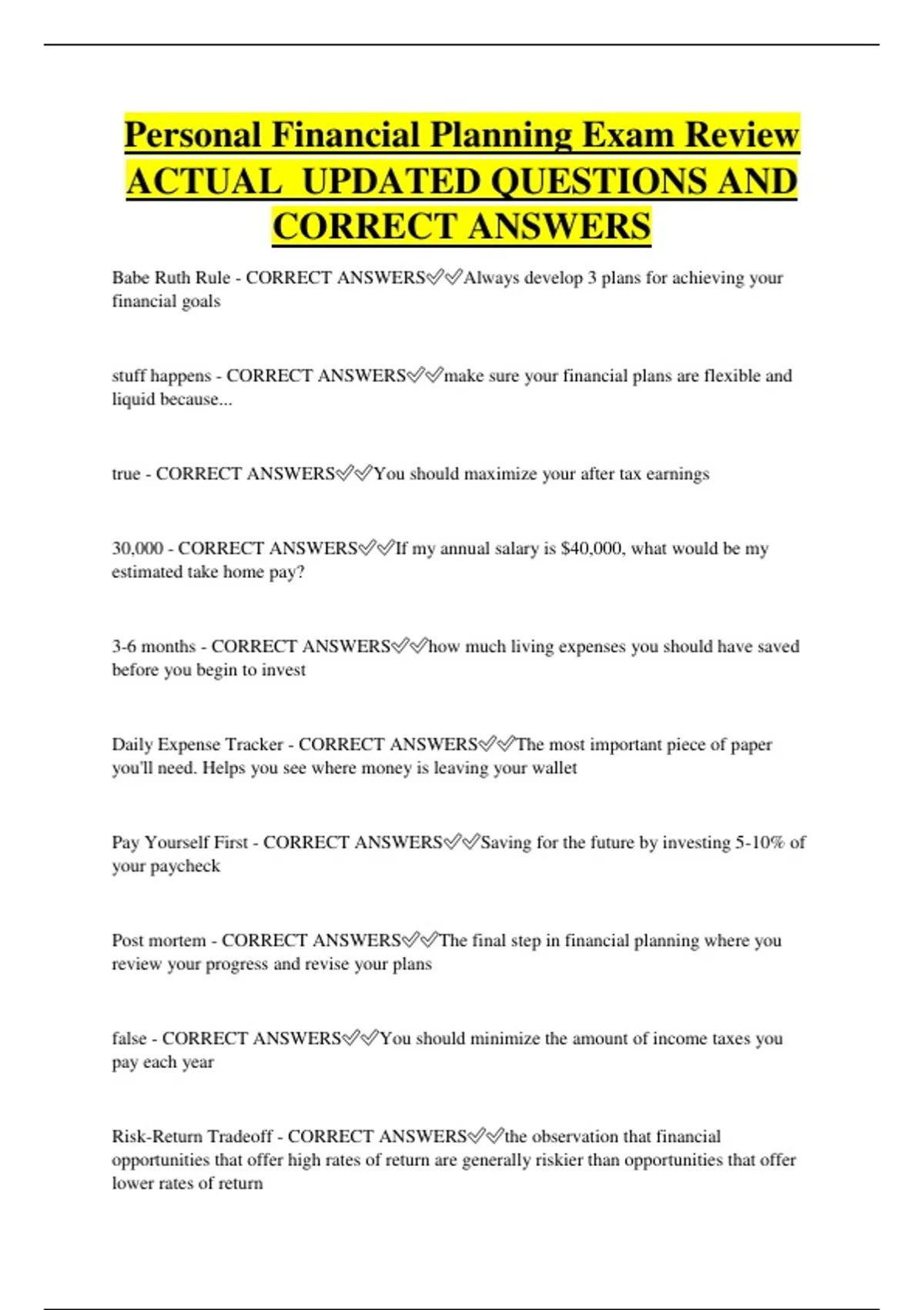 Personal Financial Planning Exam Review ACTUAL UPDATED QUESTIONS AND CORRECT ANSWERS Babe Ruth Rule - CORRECT ANSWERSAlways develop 3 plans for achieving your financial goals stuff happens - CORRECT ANSWERSmake sure your financial plans are flexible and liquid because... true - CORRECT ANSWERSYou should maximize your after tax earnings 30,000 - CORRECT ANSWERSIf my annual salary is $40,000, what would be my estimated take home pay? 3-6 months - CORRECT ANSWERShow much living expenses you should have saved before you begin to invest Daily Expense Tracker - CORRECT ANSWERSThe most important piece of paper you'll need. Helps you see where money is leaving your wallet Pay Yourself First - CORRECT ANSWERSSaving for the future by investing 5-10% of your paycheck Post mortem - CORRECT ANSWERSThe final step in financial planning where you review your progress and revise your plans false - CORRECT ANSWERSYou should minimize the amount of income taxes you pay each year Risk-Return Tradeoff - CORRECT ANSWERSthe observation that financial opportunities that offer high rates of return are generally riskier than opportunities that offer lower rates of return B D A E C - CORRECT ANSWERSA. Develop a plan of action (or 3).