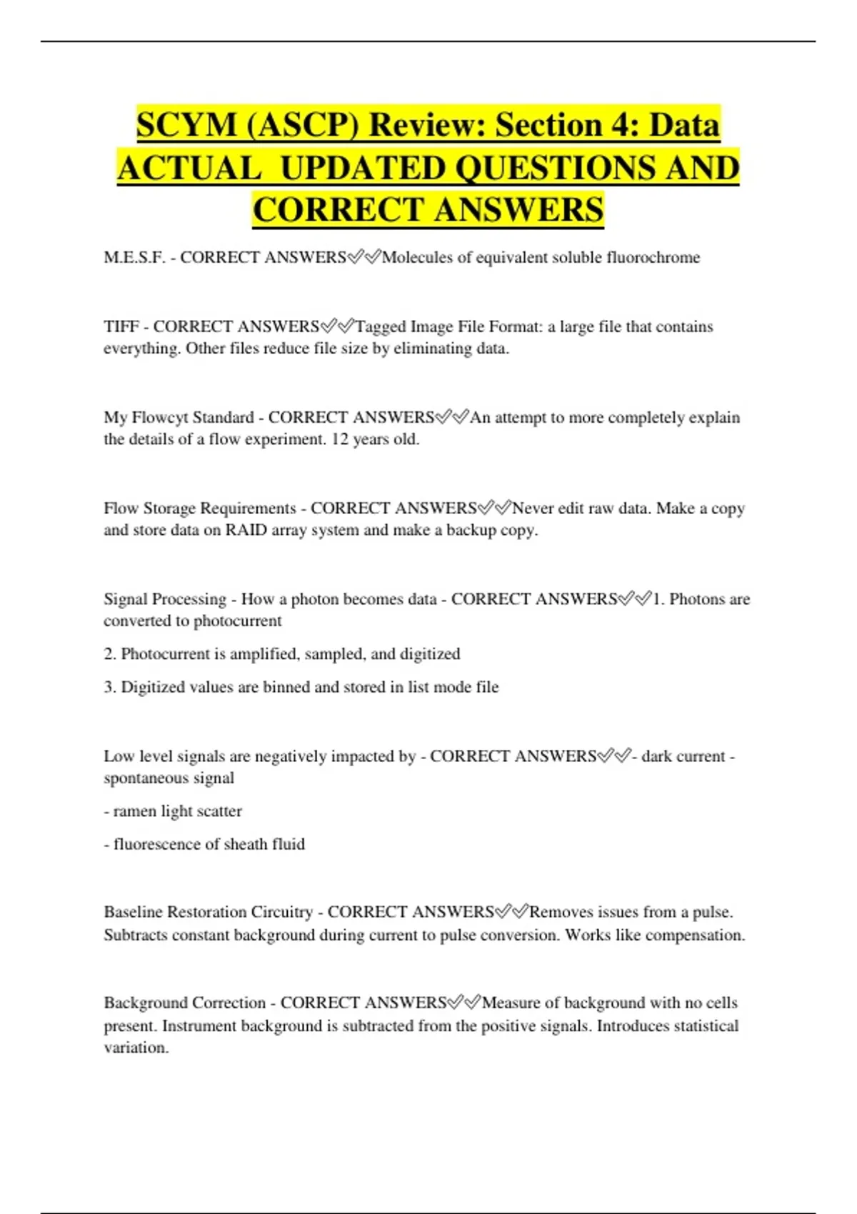 SCYM (ASCP) Review: Section 4: Data ACTUAL UPDATED QUESTIONS AND CORRECT ANSWERS M.E.S.F. - CORRECT ANSWERSMolecules of equivalent soluble fluorochrome TIFF - CORRECT ANSWERSTagged Image File Format: a large file that contains everything. Other files reduce file size by eliminating data. My Flowcyt Standard - CORRECT ANSWERSAn attempt to more completely explain the details of a flow experiment. 12 years old. Flow Storage Requirements - CORRECT ANSWERSNever edit raw data. Make a copy and store data on RAID array system and make a backup copy. Signal Processing - How a photon becomes data - CORRECT ANSWERS1. Photons are converted to photocurrent 2. Photocurrent is amplified, sampled, and digitized 3. Digitized values are binned and stored in list mode file Low level signals are negatively impacted by - CORRECT ANSWERS- dark current - spontaneous signal - ramen light scatter - fluorescence of sheath fluid Baseline Restoration Circuitry - CORRECT ANSWERSRemoves issues from a pulse. Subtracts constant background during current to pulse conversion. Works like compensation. Background Correction - CORRECT ANSWERSMeasure of background with no cells present. Instrument background is subtracted from the positive signals. Introduces statistical variation. Histogram - CORRECT ANSWERSLimited usefulness. Hard to identify rare events. Bivariant Plots - CORRECT ANSWERSVisualization of 2 stains. Density plots provide context of relative number of events. Be careful of contour plots, as they don't display well. Always indicate the number of events when using a contour plot. Higher Dimensional Analysis - CORRECT ANSWERSCluster Analysis & 3D plots Regions - CORRECT ANSWERSNumerical or geological boundary used to define characteristics of particles to include for further analysis. drawing