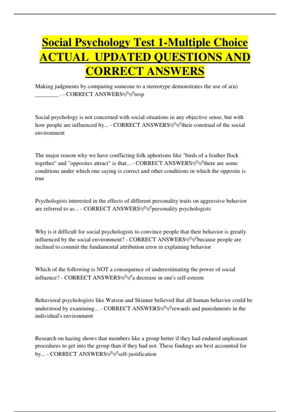 Social Psychology Test 1-Multiple Choice ACTUAL UPDATED QUESTIONS AND CORRECT ANSWERS Making judgments by comparing someone to a stereotype demonstrates the use of a(n) ________ . - CORRECT ANSWERSresp Social psychology is not concerned with social situations in any objective sense, but with how people are influenced by... - CORRECT ANSWERStheir construal of the social environment The major reason why we have conflicting folk aphorisms like "birds of a feather flock together" and "opposites attract" is that... - CORRECT ANSWERSthere are some conditions under which one saying is correct and other conditions in which the opposite is true Psychologists interested in the effects of different personality traits on aggressive behavior are referred to as... - CORRECT ANSWERSpersonality psychologists Why is it difficult for social psychologists to convince people that their behavior is greatly influenced by the social environment? - CORRECT ANSWERSbecause people are inclined to commit the fundamental attribution error in explaining behavior Which of the following is NOT a consequence of underestimating the power of social influence? - CORRECT ANSWERSa decrease in one's self-esteem Behavioral psychologists like Watson and Skinner believed that all human behavior could be understood by examining... - CORRECT ANSWERSrewards and punishments in the individual's environment Research on hazing shows that members like a group better if they had endured unpleasant procedures to get into the group than if they had not. These findings are best accounted for