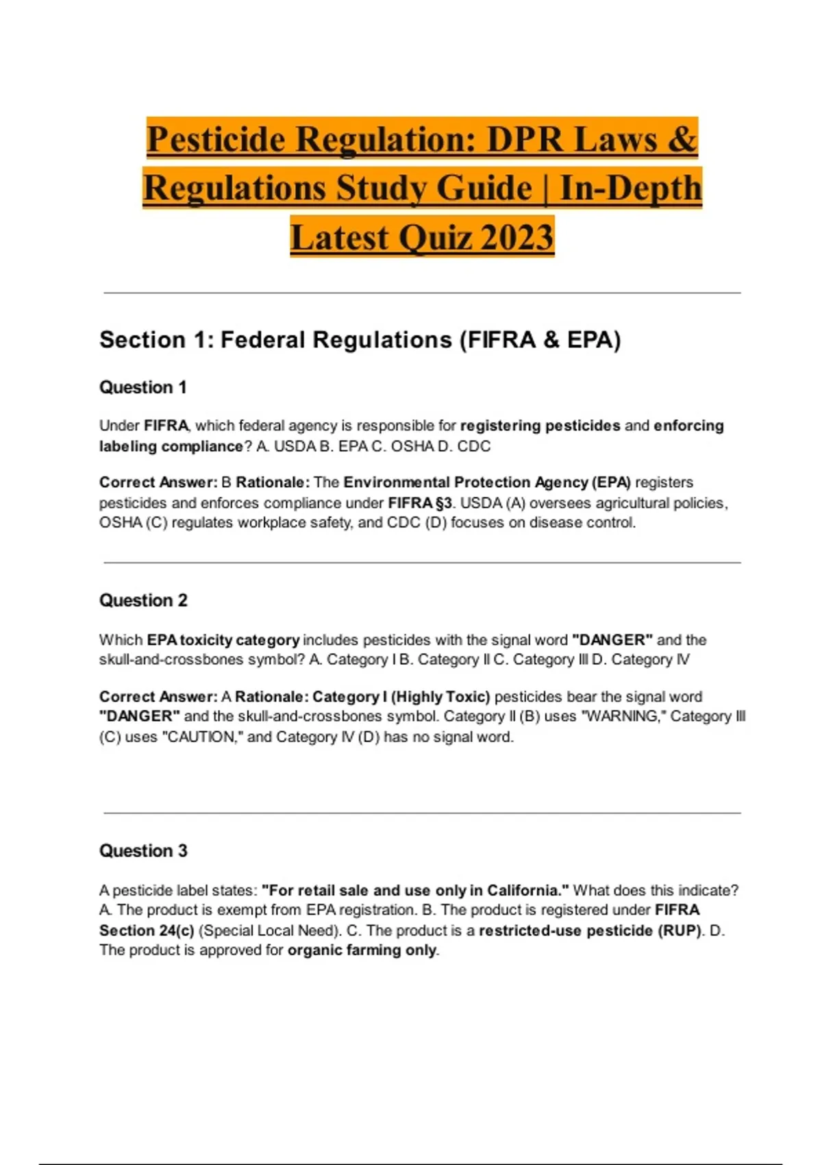 Pesticide Regulation: DPR Laws & Regulations Study Guide | In-Depth Latest Quiz 2023