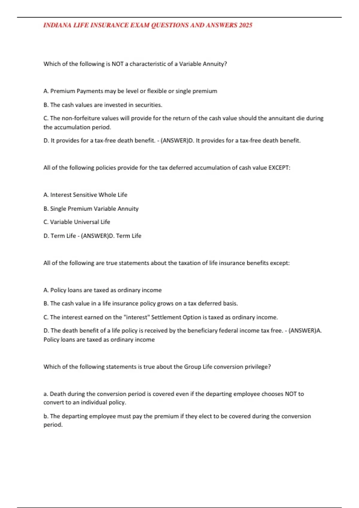 D. It provides for a tax-free death benefit. - (ANSWER)D. It provides for a tax-free death benefit.