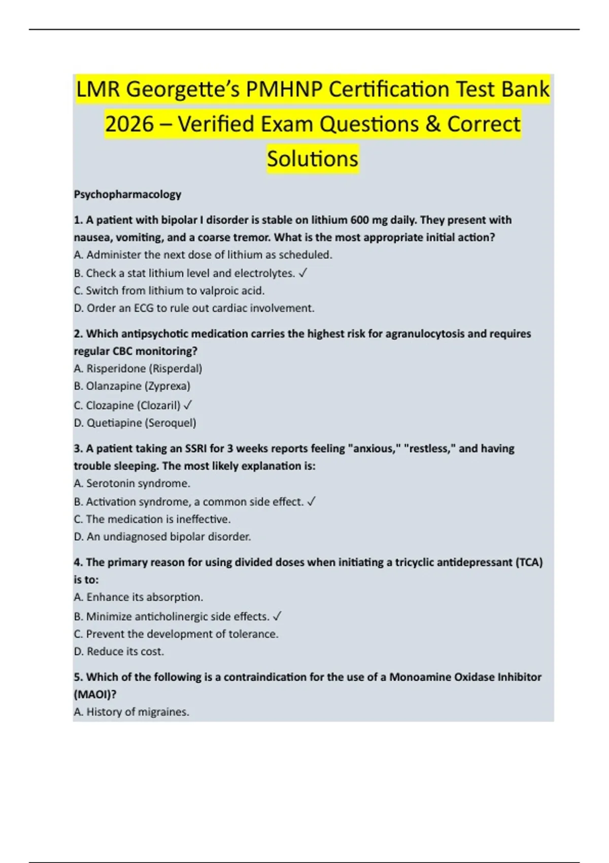 LMR Georgette’s PMHNP Certification Test Bank 2026 – Verified Exam Questions & Correct Solutions