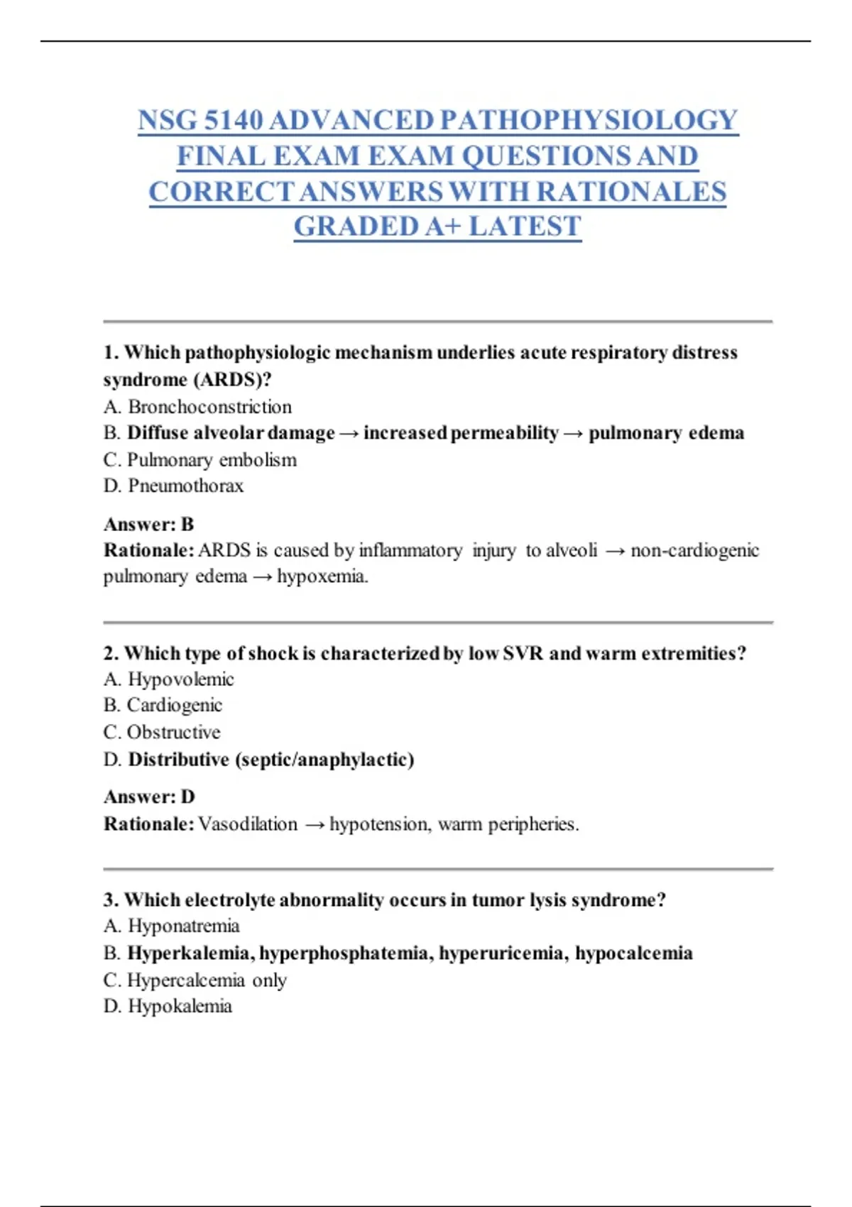 Ace your NSG 5140 final with this comprehensive practice exam. Features 100 verified questions, correct answers, and detailed rationales covering cardiovascular, endocrine, renal, and immune pathophysiology. Instant PDF download. NSG 5140, Advanced Pathophysiology, Nursing Exam, Nurse Practitioner, NP Exam, Patho Final, MSN Study Guide, NCLEX Review, Cardiovascular Patho, Acid-Base Balance, Electrolyte Imbalance, Graded A