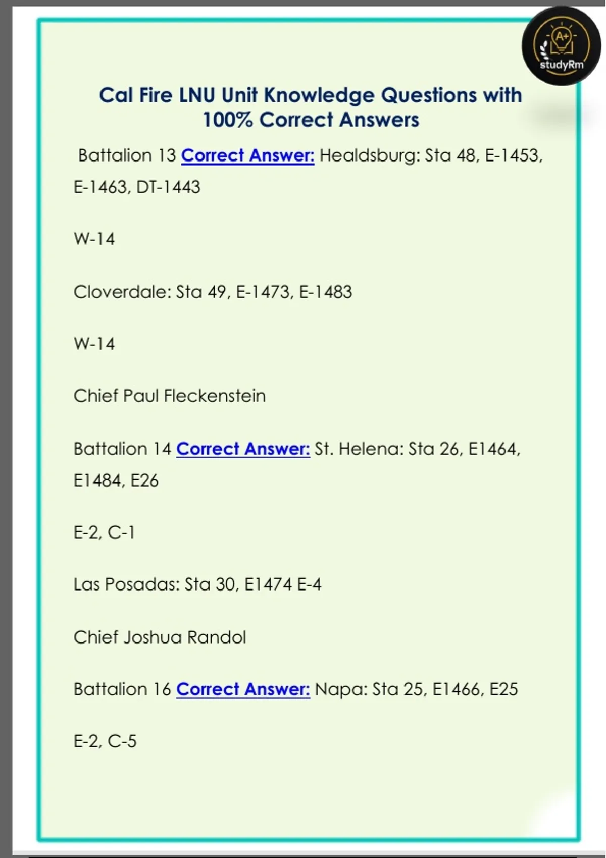 Cal Fire LNU Unit Knowledge Questions with 100% Correct Answers Cal Fire LNU Unit Knowledge Questions with 100% Correct Answers